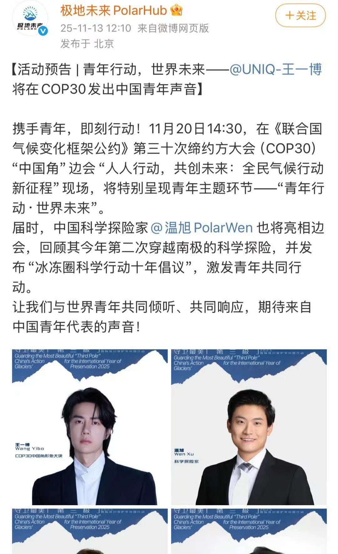 王一博COP30中国角边会活动预告将发出中国青年声音