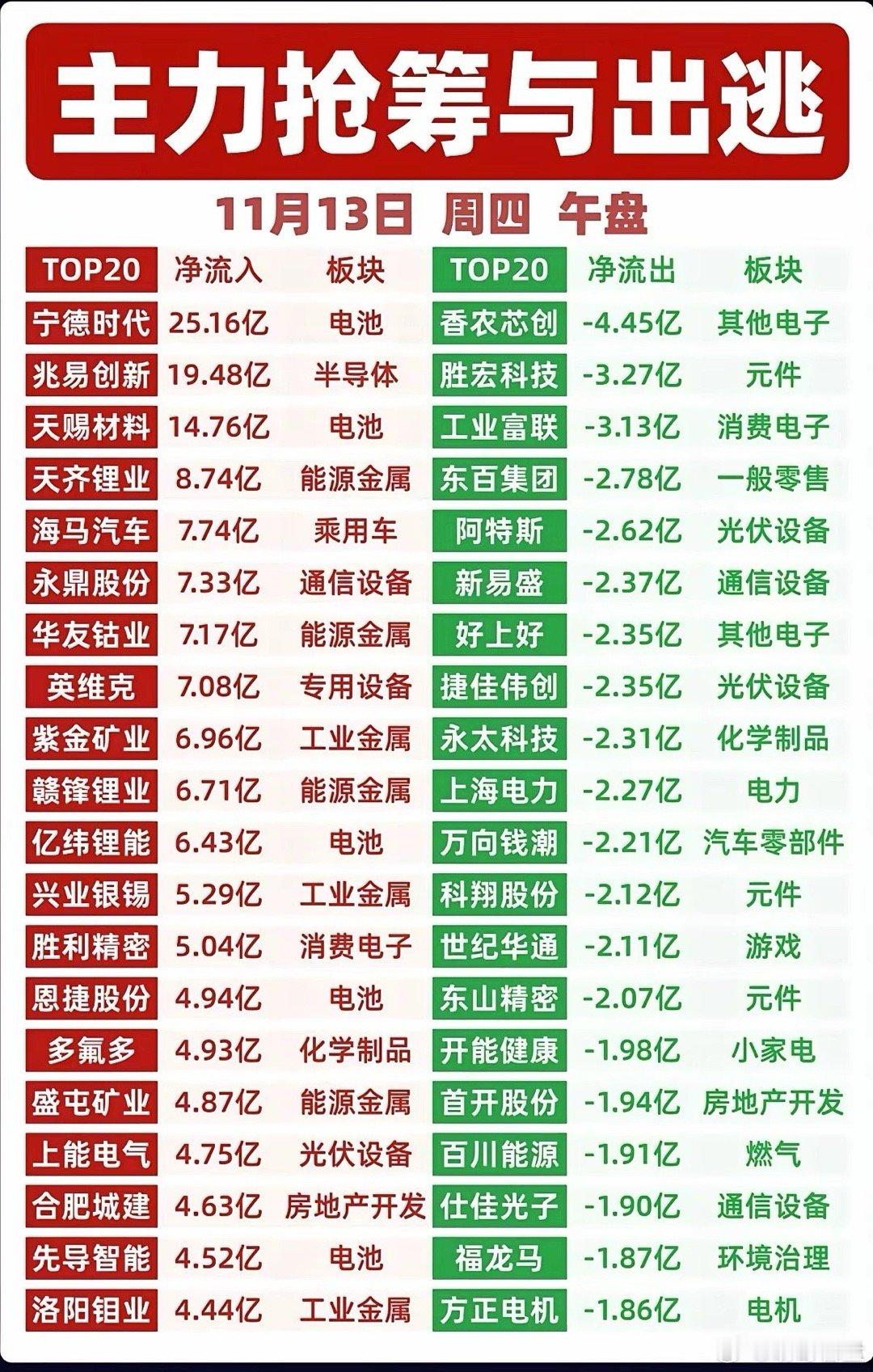 11月13日主力抢筹与出逃主力抢筹与出逃,股市风云变幻!📈📉主力抢筹电池半导体,出逃电子零售。宁德天齐获大单流入,锂电能源受捧,光伏消费电子承压。投资需谨慎。