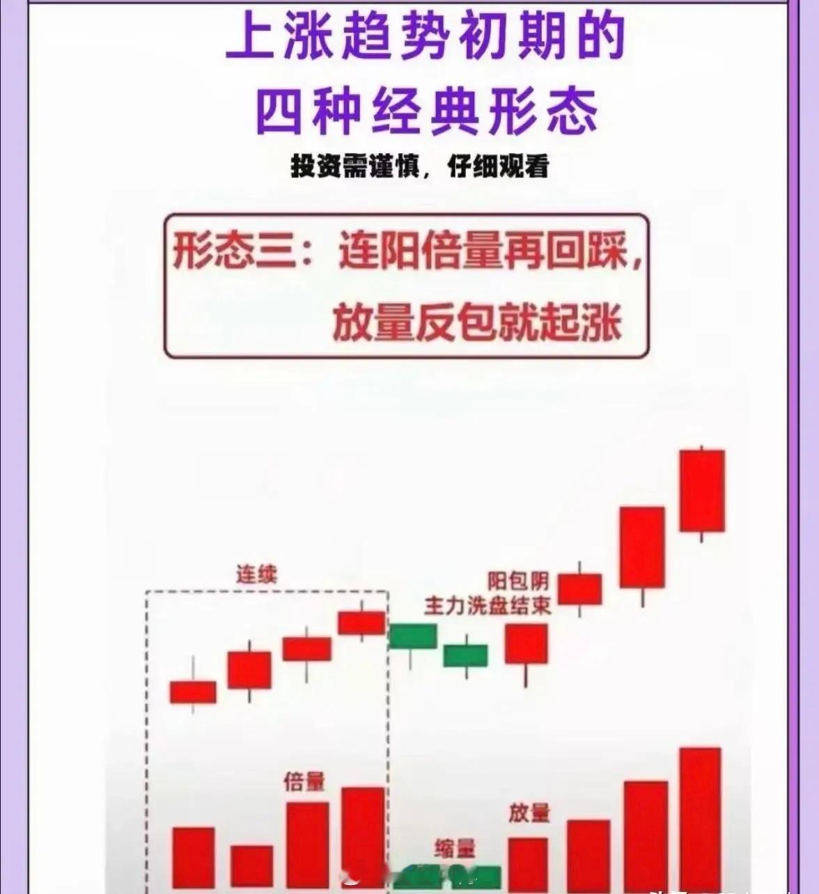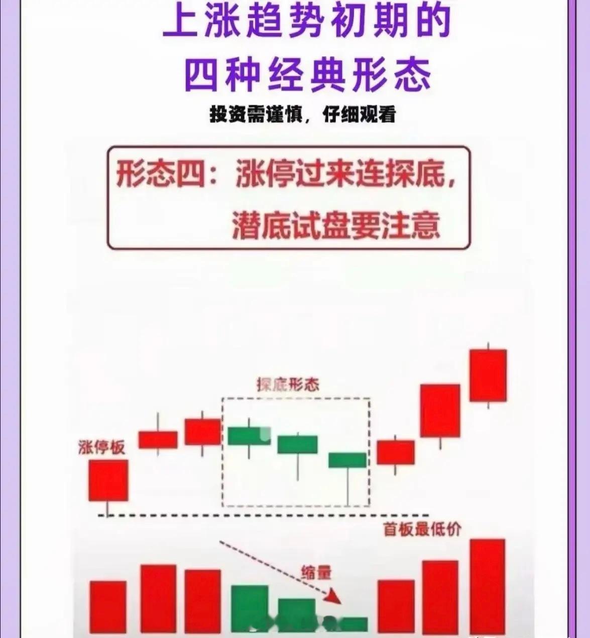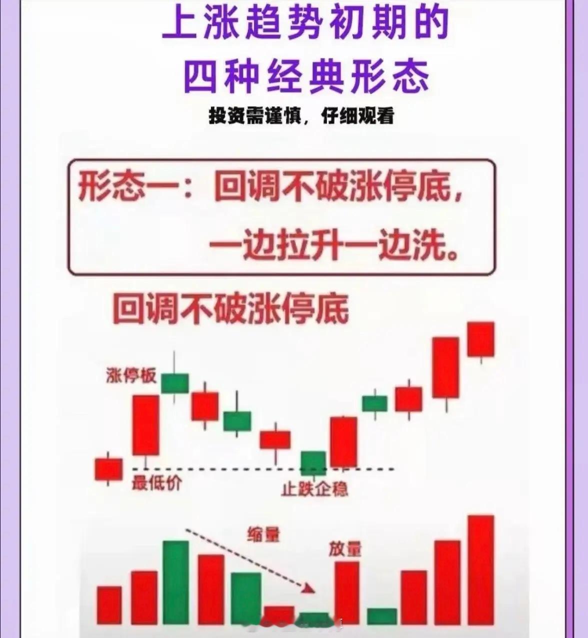识别上涨初期的四大技术形态:把握趋势启动信号在股价结束盘整进入上升通道的初期,往往会出现具有预示性的技术形态。通过对量价关系的分析,投资者可及时发现趋势转折信号,把握布局时机。以下是四种经典的上涨初期技术形态及其市场逻辑:形态一:回调不破涨停底该形态表现为股价以涨停启动后,在回调过程中始终不跌破涨停板的最低价,形成明显的支撑效应。这种"边拉升边洗盘"的走势中,成交量会呈现"放量上涨-缩量回调"的健康态势,说明主力在控制节奏的同时并未离场,后市往往还有上涨空间。形态二:涨停倍量长上影首板涨停后出现带长上影线的K线,伴随成交量倍增,俗称"仙人指路"。这种形态看似上方压力沉重,实为主力试探前高阻力的试盘动作。当后续走势能够收复上影线且保持缩量整理,通常预示着消化抛压后将继续上行。形态三:连阳倍量再回踩股价在连续收阳后出现倍量拉升,随后回踩重要均线或支撑位,最终以放量反包形态结束调整。这种"阳包阴"的结构表明主力洗盘结束,特别是回踩过程中的缩量特征,更印证了筹码稳定性,是较为可靠的起涨信号。形态四:涨停连探底涨停突破后股价连续数个交易日下探底部,但始终维持在涨停价上方运行,形成"潜底试盘"形态。这种走势中持续的缩量状态尤为关键,说明浮动筹码清洗充分。当试盘结束后放量上攻,往往意味着主力结束测试,即将开启主升浪。需要注意的是,任何技术形态都需结合大盘环境、个股基本面综合判断,投资者应保持谨慎,严格设置止损位,方能提高交易胜率。