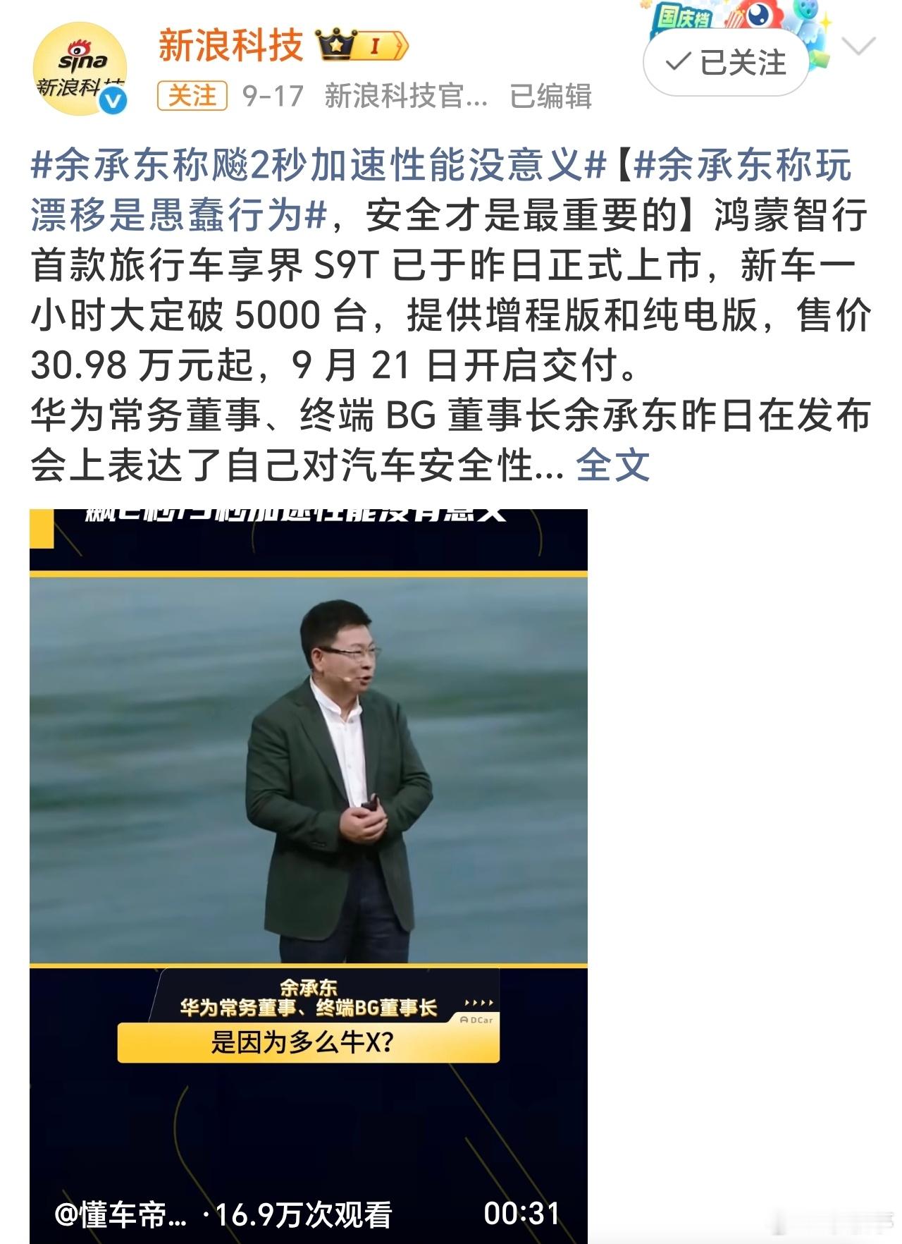 公安部将限制汽车百公里加速小于5秒?如果真这样,这和余承东的电动车过度追求百公里加速2秒、3秒没什么意义不谋而合了!