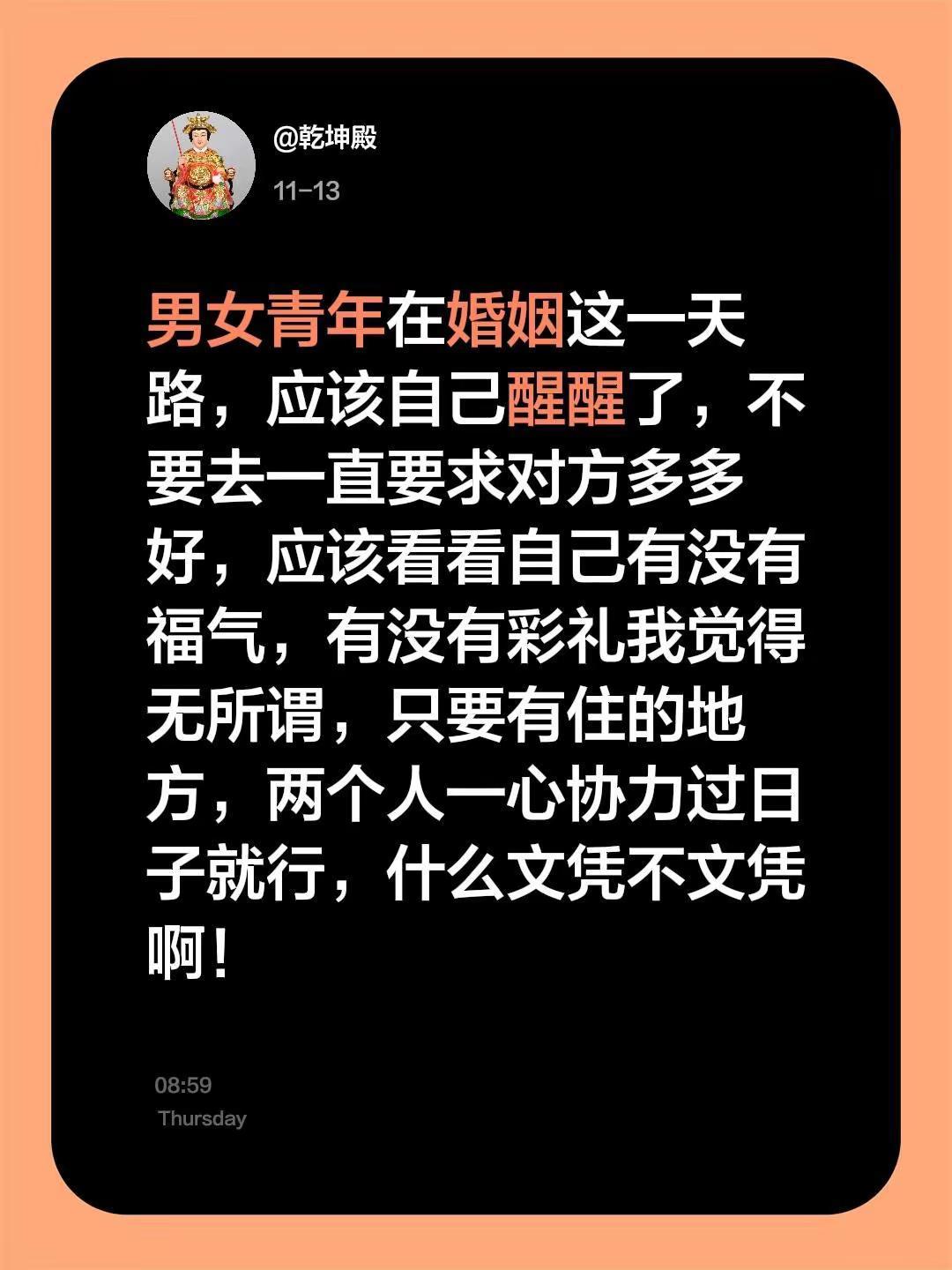 男女青年在婚姻这一天路,应该自己醒醒了,不要去一直要求对方多多好,应该看看自己有没有福气,有没有彩礼我觉得无所谓,只要有住的地方,两个人一心协力过日子就行,什么文凭不文凭啊!