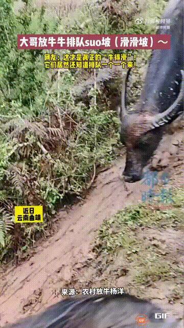 云南曲靖一个小伙在放牛时,遇到了一处泥泞的下坡山路,他担心水牛无法下来,正不知所措时,却看见一头头水牛排着队,“滋溜”一下就滑下坡去了,动作非常丝滑和呆萌,小伙觉得水牛的举动,像极了自己小时候玩滑梯的样子。 网友看完这一幕,都觉得这群水牛真是太有趣了,没想到它们面对一个泥泞的下坡山路,居然有自己的办法滑下坡去,并且一头头排着队,看起来就像是在玩游戏一样,给人一种享受的感觉,万物皆有灵,相信它们当时也能从中感受到一丝快乐吧。大家怎么看呢?