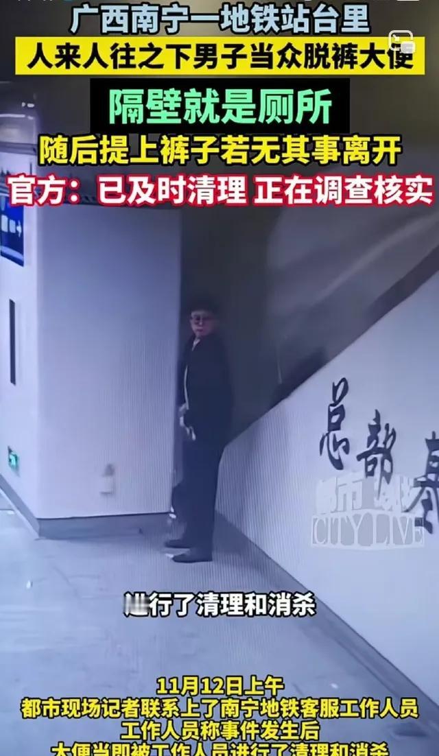 “厕所就隔两步!”广西南宁地铁3号线,一夹克男站内内急,偏放过两米外的卫生间,当众脱裤蹲地解决,提裤即走,全程不擦,网友直呼:眼瞎才看不见厕所! 网友在“总部基地站”候车时,目击一名戴眼镜、拿水杯的年轻男子四下张望后,绕到墙后拐角,解带下蹲,而卫生间指示牌距其仅几步之遥。 拍摄者表示,当时站厅乘客虽不多,但人来人往,男子神色镇定,毫无遮挡,蹲下不久便起身提裤离开,未做任何清理,只留下异味与一地狼藉。 网友随后向地铁站反映,站方立即安排保洁现场清理并全面消杀,同时调取监控,通报地铁公安,目前事件正进一步调查,尚未公布男子身份信息。 法律解读指出,其行为涉嫌触犯《治安管理处罚法》第二十三条扰乱公共场所秩序,及第四十四条故意裸露身体,若情节恶劣,可处五日以上十日以下拘留,并罚款。 律师同时提醒,若当事人确因突发疾病等客观原因无法前往厕所,需举证说明,否则仍将承担相应法律责任;站方亦呼吁乘客内急可第一时间联系工作人员,切勿让不文明行为影响公共环境。 对于这件事情,大家有什么看法?