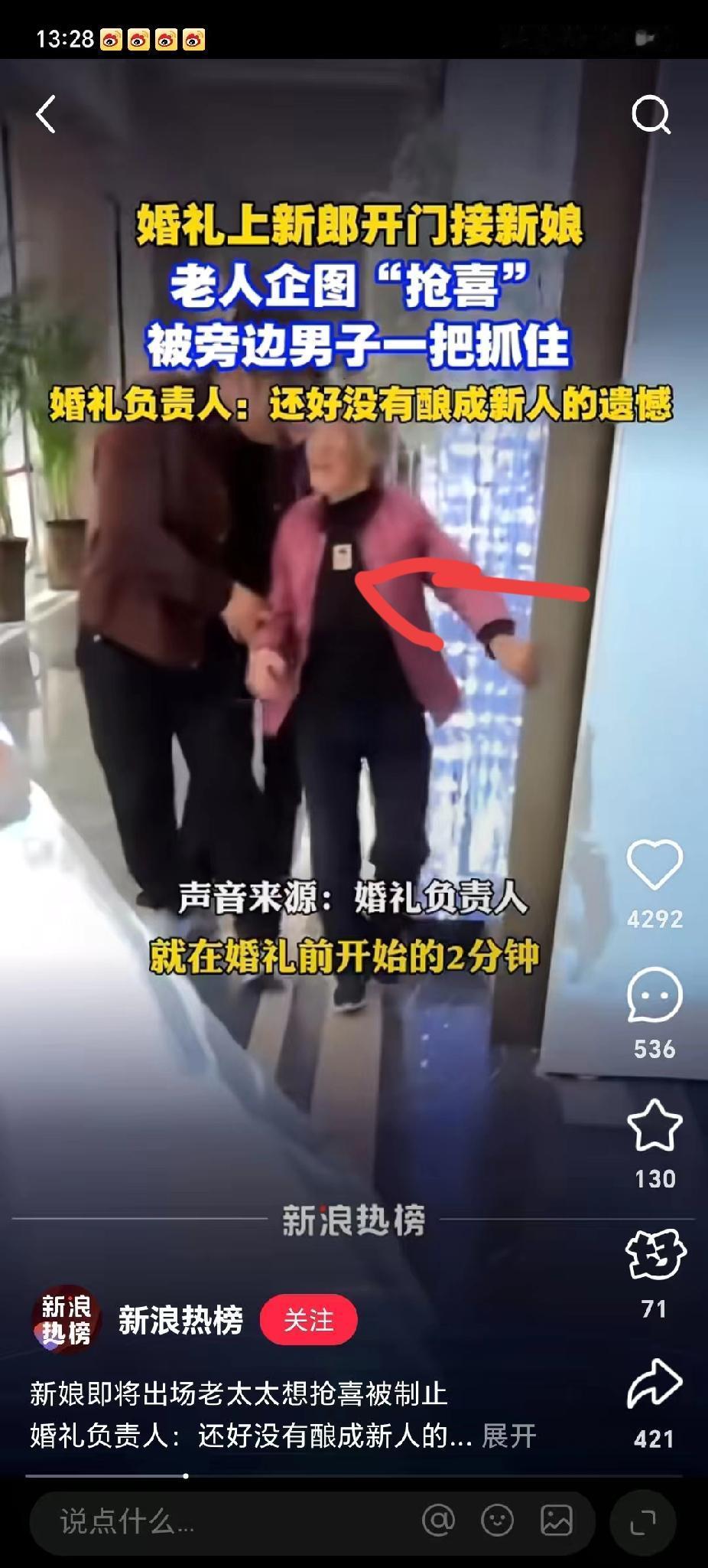 人心太坏了! 河南平顶山,新郎准备迎接新娘,拉开大门的时候,一个身穿红色老太太就想冲进来抢喜! 还好旁边的小哥猛地拉住了他,没有造成这对新人的遗憾! 穿红棉袄的老奶奶,胸口还贴着他老伴的黑白照片!希望能抢走新娘的福气,多活几年!一直以为是无意的,可能老人年纪大了,脑子有点迟钝了,但是老太太迅速的往里走,还真是有故意的! 难怪现在酒店的规定婚礼之前,服务员也要在两边挡住乱走的人! 河南新娘 平顶山抬花轿 平顶山结婚礼服 平顶山结婚酒店