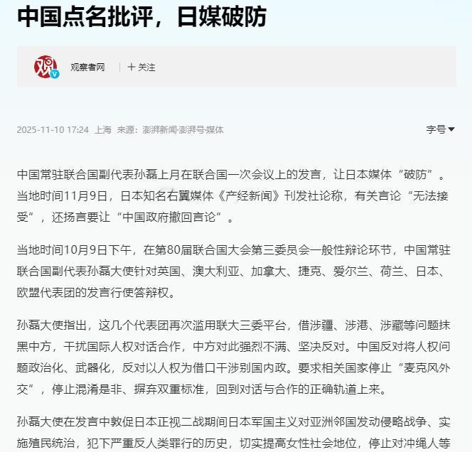 简直炸裂!联合国会场上直接吵翻天了!31个国家组团围攻中国,本以为是场硬仗,谁知道中方一个反手,就把日本单独拎出来给“开刀”了。这到底是怎么一回事?在那么多跳得老高的国家里,为什么偏偏是日本,成了那个被重点“关照”的倒霉蛋? 10月9号,在纽约的联合国总部,第80届联大三委正在开一般性辩论,这个委员会说白了就是各国坐下来聊人权、社会这些话题的地方,向来是西方国家找我们茬的主战场。 果不其然,英国最先挑头,拉上欧盟、澳大利亚、加拿大等31老面孔组团在涉疆、涉港、涉藏问题上对我们进行惯例抹黑,说我们“侵犯人权”。 谁知道我们反手就把日本单独拎出来“开刀”,这可不是随便挑的,日本这几年在国际上的操作,早就把自己架在了风口浪尖上。而就人权问题上,日本自己屁股底下就一堆没擦干净的事儿。 就拿冲绳来说,这个只占日本国土面积0.6%的地方,却集中了全日本70.3%的美军基地,不到2000平方公里的岛上密密麻麻挤着嘉手纳、那霸这些基地,美军训练的噪音从早到晚没停过,燃油泄漏污染环境是常事,甚至还有直升机坠落的安全隐患。 更让人窝火的是美军的“治外法权”,1972年到2020年这几十年里,冲绳美军基地就发生了6029次犯罪事件,就算出了性侵这样的恶性案件,美国士兵也能靠着《日美地位协定》逍遥法外,当地民众抗议了一次又一次,日本政府却始终装聋作哑。 再看看核废水那档子事,日本倒是挺敢干,不顾周边国家反对,硬要把核污染水往海里排,截至2025年已经排了不少,周边国家渔民的生计都受影响了,这直接损害了周边国家民众的健康权。 联合国人权理事会在2025年10月的审议中,中方就明确提出让日本以公开、透明、安全的方式处置核污染水,可日本嘴上答应着,实际行动却一点没见收敛。 历史问题上日本更是越走越偏,2025年春季文部科学省通过的高中历史教科书,把南京大屠杀轻描淡写改成“南京事件”,还在死亡人数上搞模糊化,对“慰安妇”制度居然用“女性从事相关从业”这种遮遮掩掩的说法。 日本前首相石破茂,在广岛核爆纪念日上光说受害者多惨,却绝口不提日本发动侵略战争的根源,8月15日的追悼仪式上也对侵华史实避而不谈,就用“铭记悔恨与教训”这种空话糊弄过去。 日本一边忙着篡改历史,一边还想游说别的国家不参加中国的九三阅兵,这种又当又立的做派,在联合国这样的场合被揪出来实在不冤。 更关键的是,日本这些年一直跟着美国在亚太地区搞事情,嘴上喊着人权,自己却在冲绳搞种族歧视,本土人对冲绳人叫“土人”,2016年大阪警察在冲绳反基地示威时骂群众“土人”,政府还说“无法判断有歧视意涵”。 这种双重标准玩得溜,却忘了自己满身的虱子。中方这次把日本拎出来,既是因为日本的问题确实比其他国家更突出,也是因为它总爱跟着西方阵营凑热度当马前卒,正好拿它当例子,让大家看看谁才是真正的人权问题制造者。 毕竟在事实面前,再多的围攻也站不住脚,日本这回被重点“关照”,只能说是自作自受。