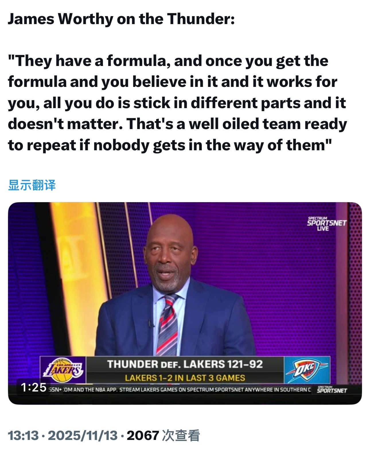 湖人名宿沃西谈雷霆队:“他们有一套成熟的战术体系,一旦你摸透这套体系、坚信它能奏效,那不管替换哪些球员,这套体系都能运转起来。这是一支磨合度极佳的球队,只要没人搅局,他们完全有能力卫冕成功。”