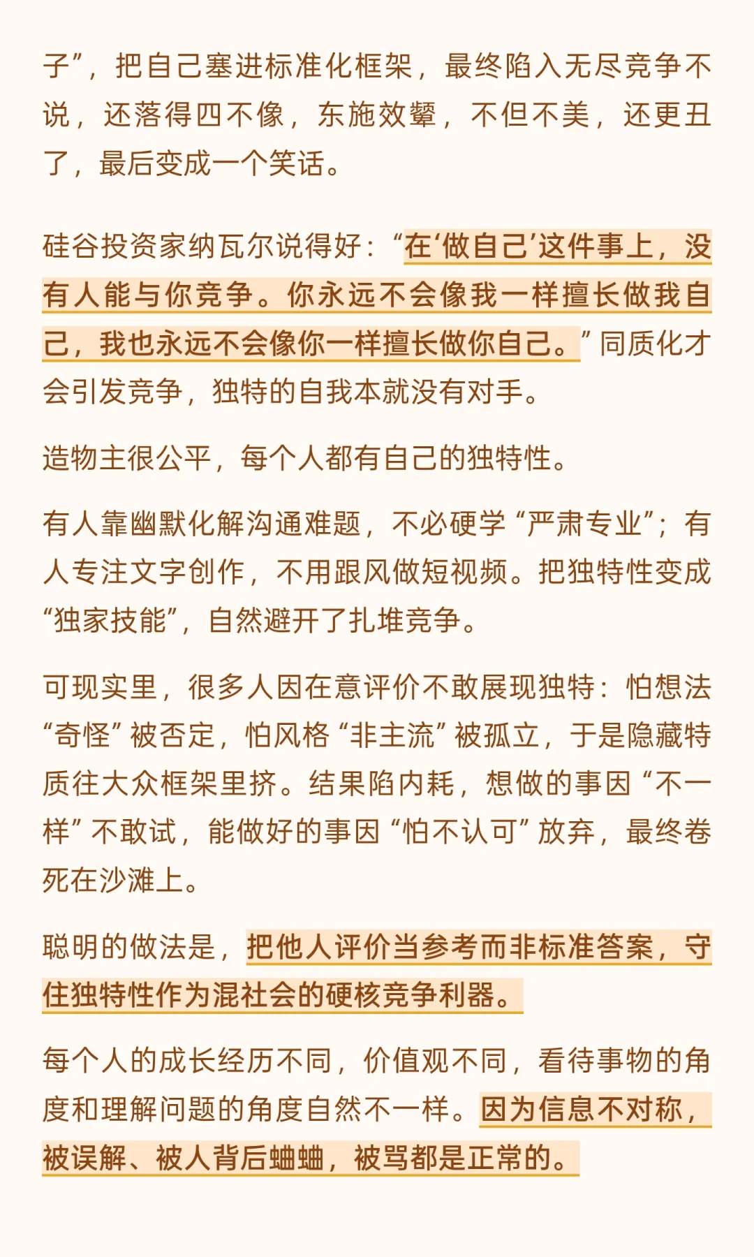 硅谷投资家纳瓦尔说得好:“在‘做自己’这件事上,没有人能与你竞争。你永远不会像我一样擅长做我自己,我也永远不会像你一样擅长做你自己。” 同质化才会引发竞争,独特的自我本就没有对手。