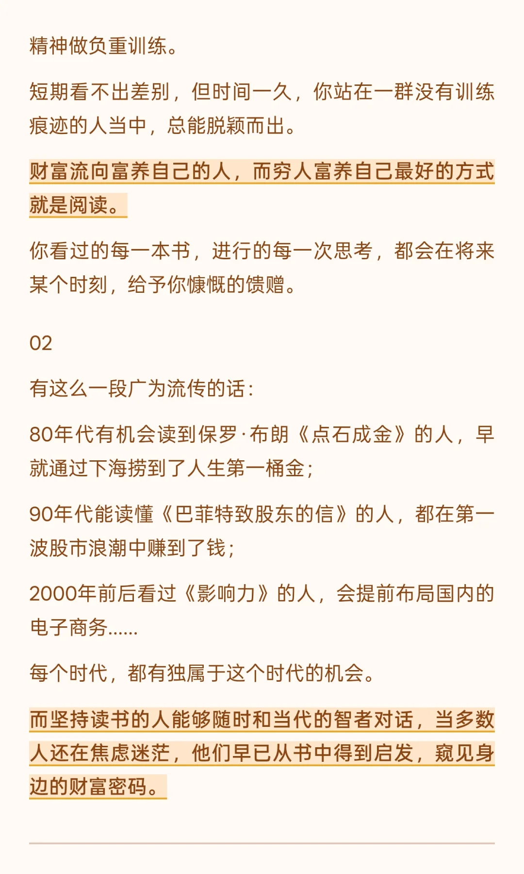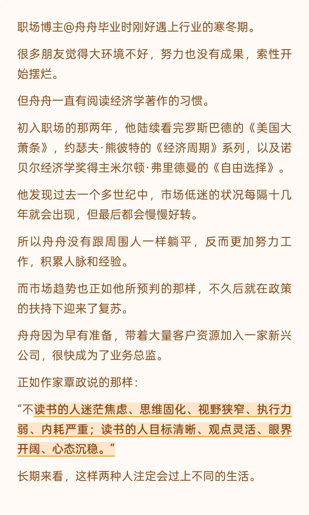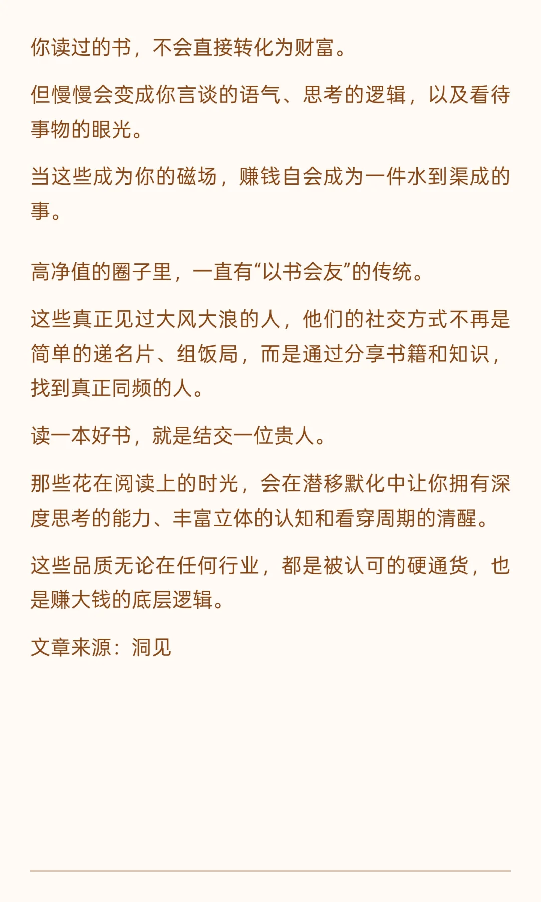 读书是精神富养的最佳方式,能塑造思维、开阔视野、提升竞争力。 坚持阅读的人能在迷茫中找到方向,在困境中抓住机会,最终实现自我突破和财富增长。 据说,高净值的圈子里,一直有“以书会友”的传统。 这些真正见过大风大浪的人,他们的社交方式不再是简单的递名片、组饭局,而是通过分享书籍和知识,找到真正同频的人。 读一本好书,就是结交一位贵人。 那些花在阅读上的时光,会在潜移默化中让你拥有深度思考的能力、丰富立体的认知和看穿周期的清醒。 这些品质无论在任何行业,都是被认可的硬通货,也是赚大钱的底层逻辑。
