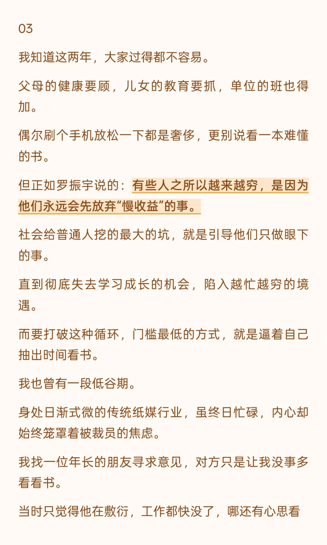 很喜欢的一段话:“人到中年,无人不苦,唯有努力赚钱。人生在世,没有钱的支撑