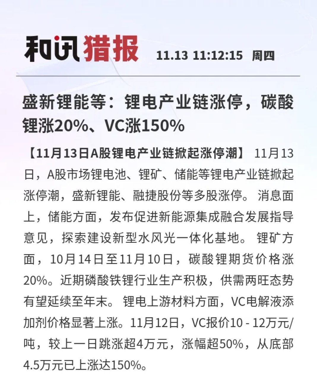 锂电产业链掀涨停潮!盛新锂能等领涨,碳酸锂涨20%、VC涨幅超150%11月13日A股锂电赛道全面爆发,锂电池、锂矿、储能等细分板块集体走强,掀起涨停热潮,盛新锂能、融捷股份等多只核心标的强势封板,资金对锂电产业链的关注度显著升温。多重利好因素共同催化板块行情:政策端,国家层面发布《关于促进新能源集成融合发展的指导意见》,明确探索建设新型水风光一体化基地,为储能行业发展注入强劲动力,间接带动锂电产业链需求;资源端,锂矿价格持续回暖,10月14日至11月10日期间,碳酸锂期货价格累计上涨20%,叠加磷酸铁锂行业生产积极性高涨,供需两旺的态势有望延续至年末,支撑产业链盈利修复;上游材料端,VC电解液添加剂价格迎来爆发式上涨,11月12日报价10-12万元/吨,较前一日跳涨超4万元,单日涨幅超50%,相较于底部4.5万元/吨的价格,累计涨幅已高达150%,成为拉动板块情绪的重要推手。