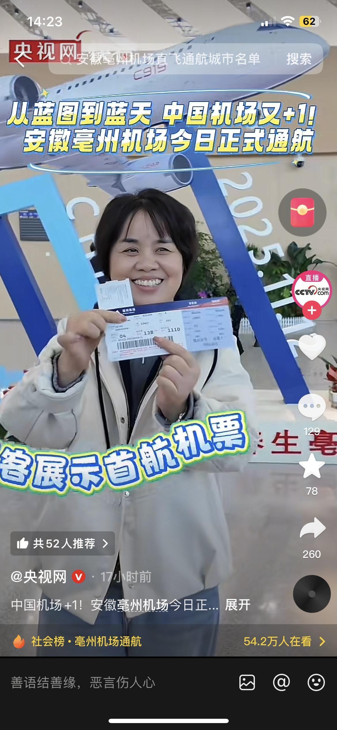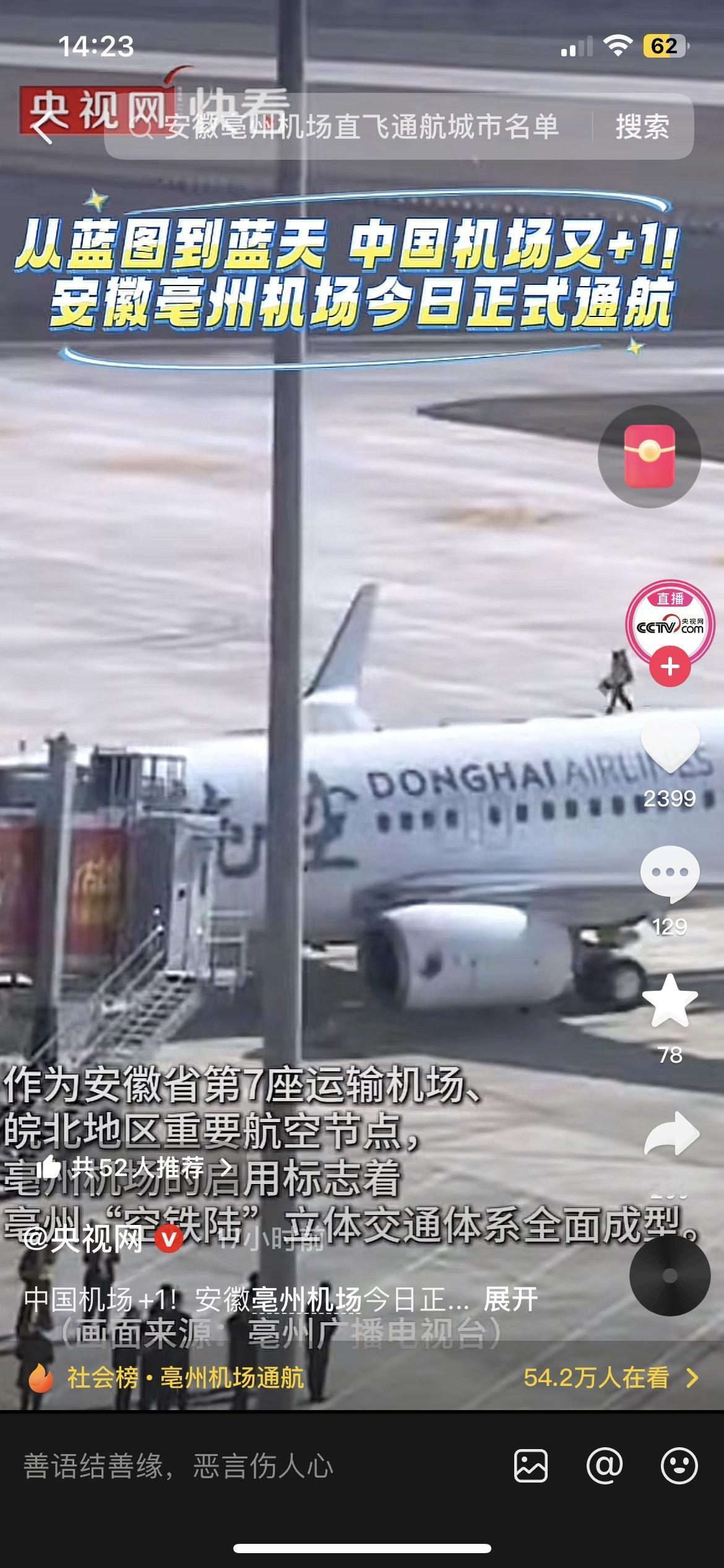 官宣!安徽亳州机场11月12日正式通航,首航飞深圳! 家人们,皖北老乡盼疯了的机场终于通航了!2025年11月12日,亳州民用机场首航航班落地——东海航空DZ6223从深圳飞来,穿过民航最高礼仪“水门”,标志着机场正式投用!这是安徽第7座民用机场,首批开通4条航线,能飞北京、深圳、昆明等8个城市,亳州到深圳两小时直达,再也不用绕路啦!亳州的朋友,你最想坐新机场的飞机去哪儿? 话题:亳州机场11月12日正式通航 安徽新增民用机场