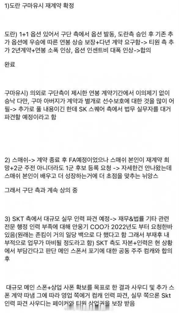 【传言】韩网爆料Gumayusi续约!Gumayusi:虽然没有异议地接受了俱乐部提出的年薪合同,但 Gumayusi 父亲要求在合同外增加更多的选手保护条款。→ 由于这是需要额外补充的内容,预计 SK Square 将派遣法务实务人员前往处理。Smash:合同原定到期后将成为自由人(FA),但 Smash 本人希望 续约,希望即使不是固定首发,也能被列入一队候补名单。