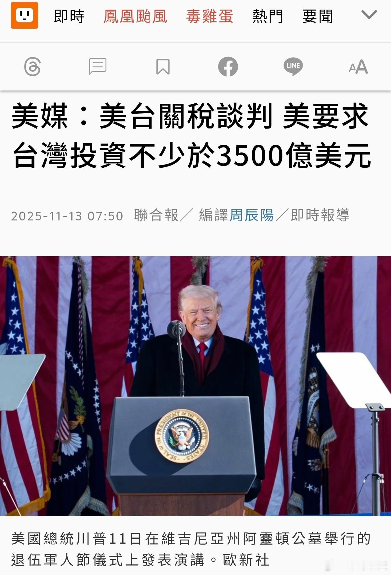 美国关税,要求台湾再交3500亿美元保护费美媒Politico 12日报导,超过6位外国外交官与知情人士透露,美国与民进党当局目前正就协议中要求台北在美国大笔投资的条款进行拉锯,该条款的设计仿效美方与韩日两国达成的类似承诺。知情人士表示,民进党的投资承诺金额将「介于韩国的3500亿美元与日本的5500亿美元之间」。另一位知情人士透露,如果美国政府停摆能尽快结束,民进党希望能在本月底前完成协议。按照日韩此前协议,对美“投资”后,如果有利润也大部分不准离开美国,需要重复用回在美国本土。