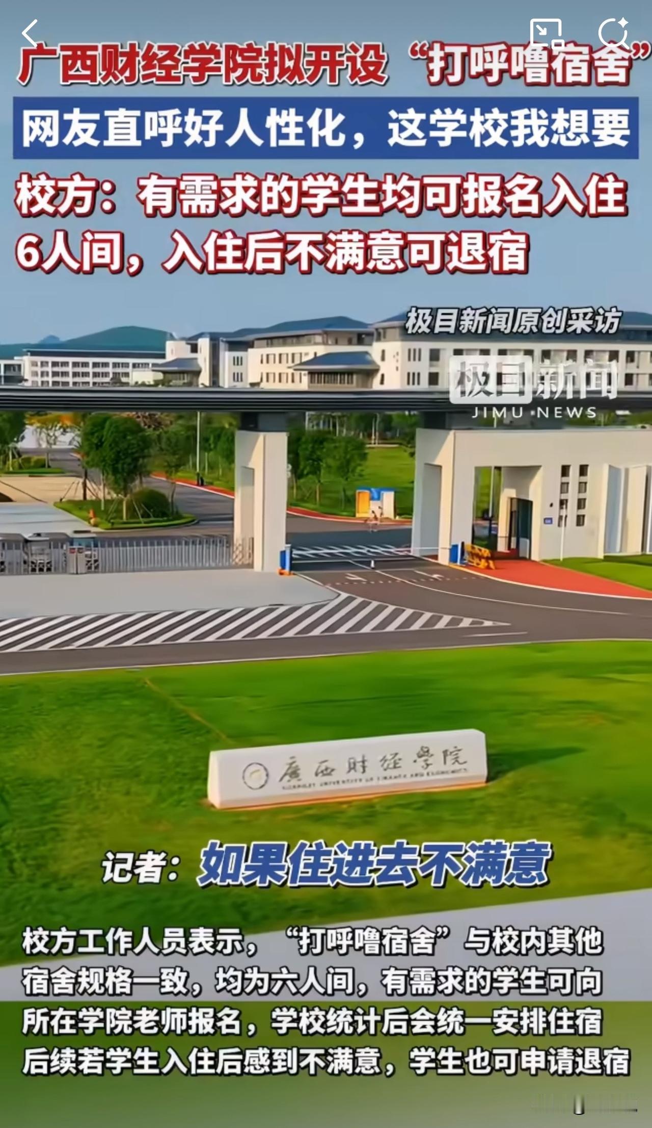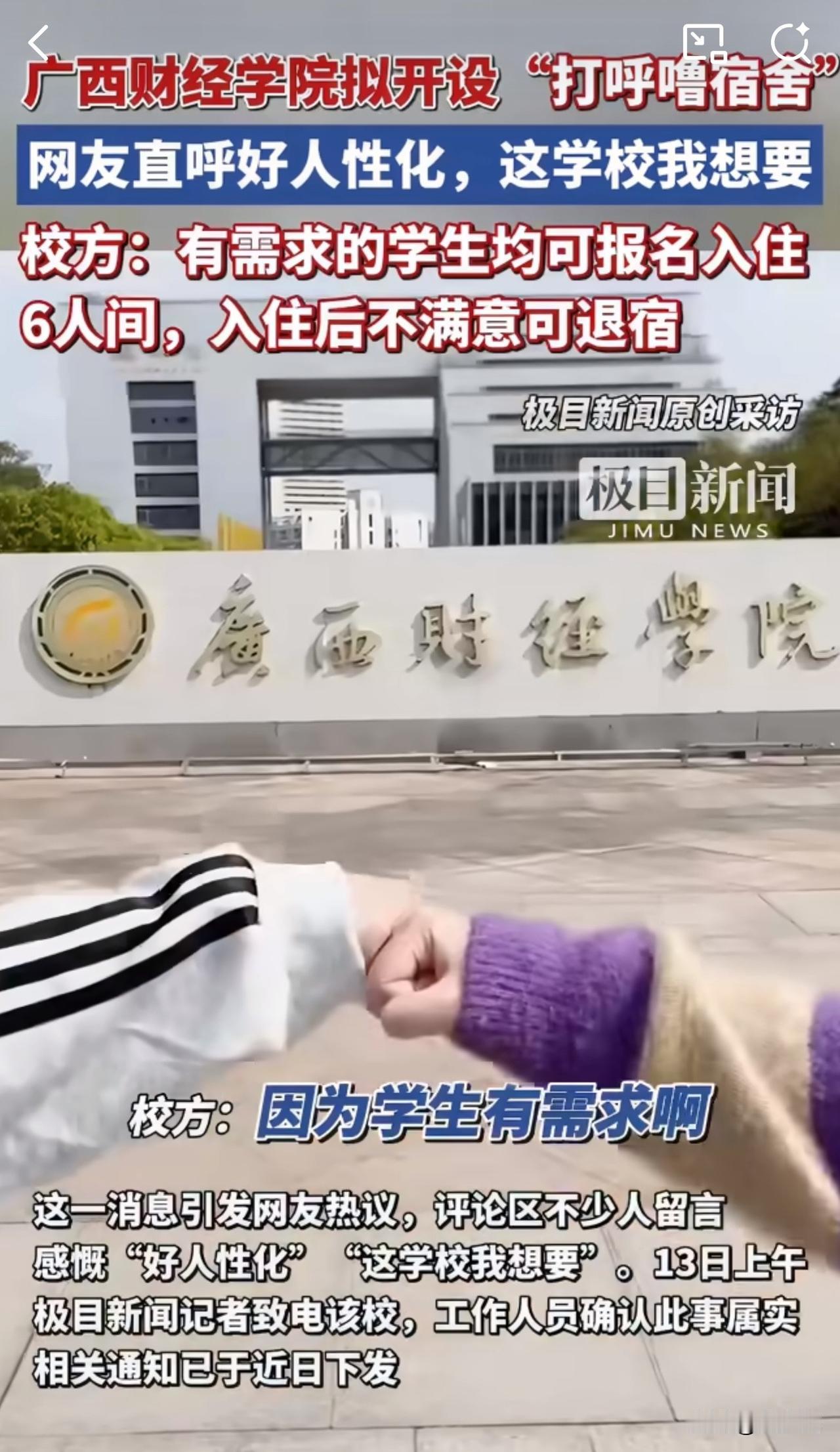 #MCN双量进阶计划#广西一高校火了!拟设“打呼噜宿舍”,不满意还能退! 广西财经学院冲上热搜!网传该校计划在明秀、相思湖两校区各设两间“打呼噜宿舍”,共计四间,引发网友狂赞“太贴心”。 校方工作人员确认此事属实,称开设“打呼噜宿舍”是响应学生诉求、经协商出台的举措,旨在优化休息环境。宿舍为六人间,与普通宿舍规格一致,有需求学生可向学院报名,后续不满意还能申请退宿,目前入住时间未确定。 此话一出,众多网友纷纷称赞道:“人性化天花板!终于不用为打呼噜互相折磨了,建议全国高校推广,太懂住宿生的痛了!” 周少也说这个举措真的太赞了,对于睡眠质量不好,又讨厌打呼噜的人而言,简直是福音。不得不说该校跳出“一刀切”管理模式,精准对接学生特殊需求,用“打呼噜宿舍”化解住宿矛盾,尽显人文关怀。 比起刻板规定,这种灵活变通的举措,既尊重了个体差异,也让校园氛围更温暖。小事见大,这样的教育温度,值得更多高校学习借鉴。 对于广西这一高校拟开设打呼噜宿舍,大家怎么看呢?#寻美三湘# #长沙新朋友#