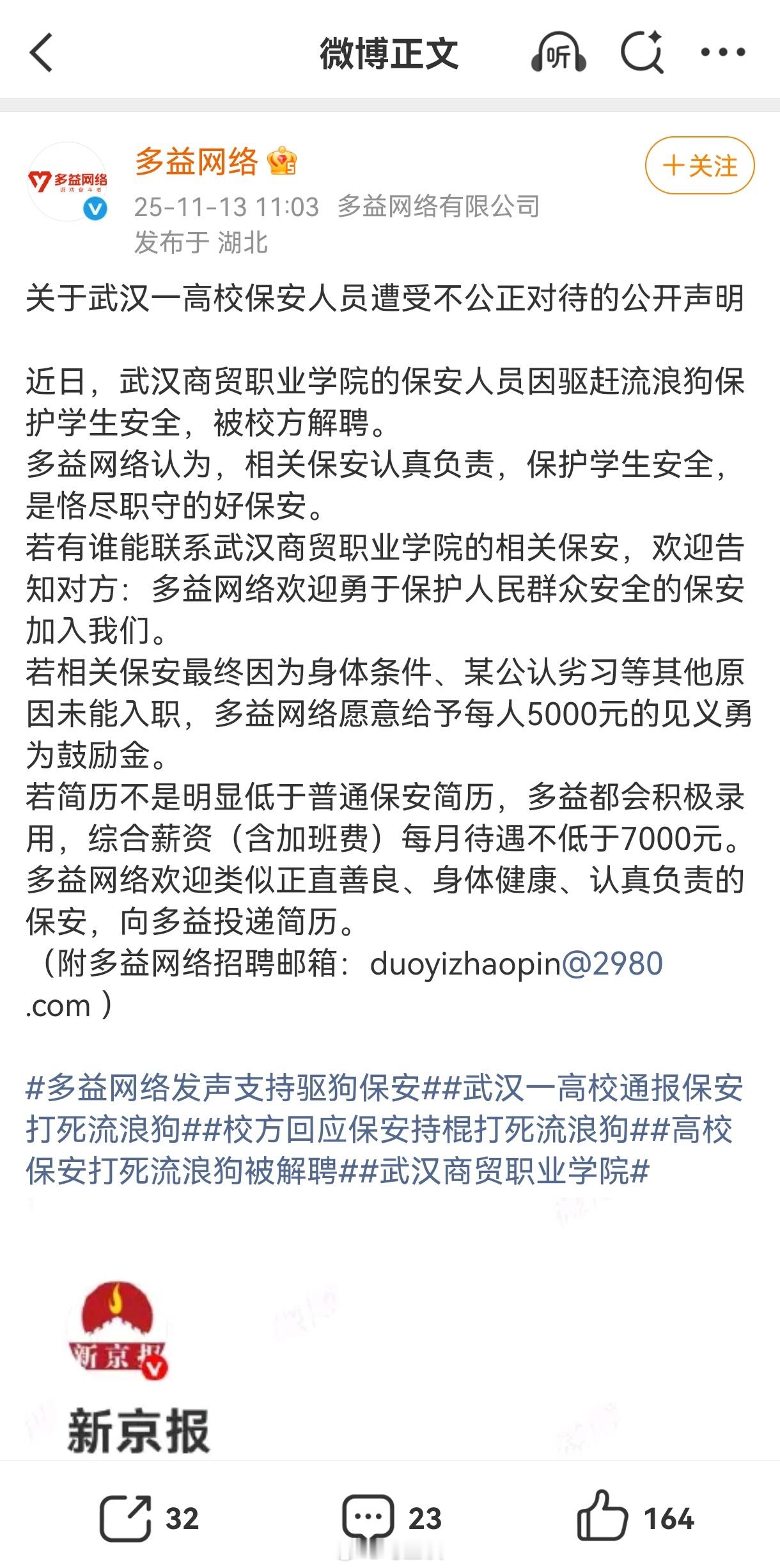 多益网络愿意招聘因为打死流浪狗被开除的高校保安,并给予5000元的见义勇为鼓励金。这才是正义的企业,必须点赞!👍🏻