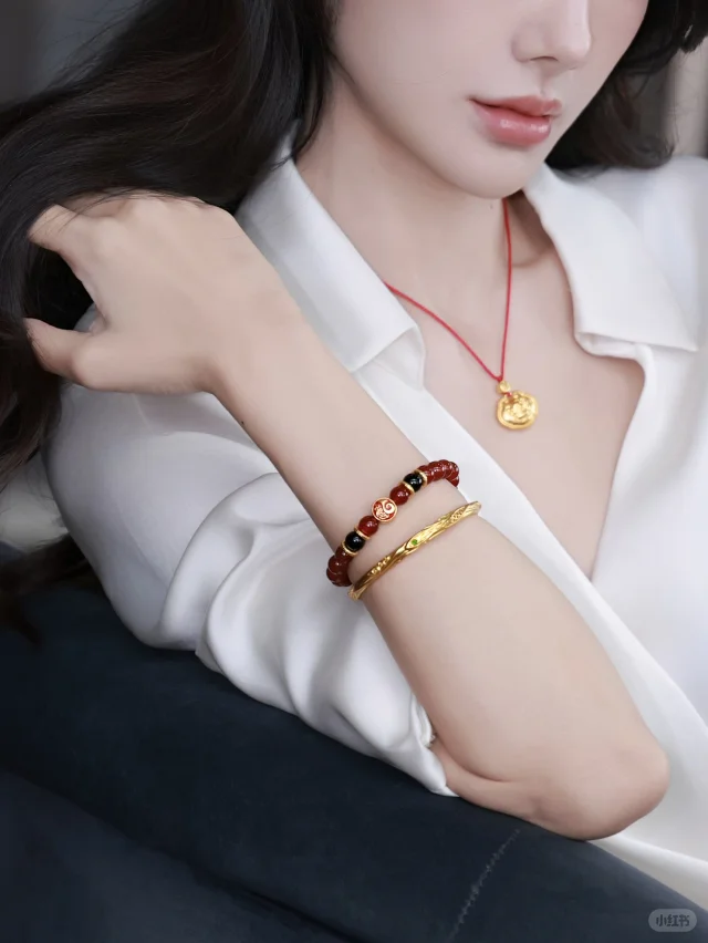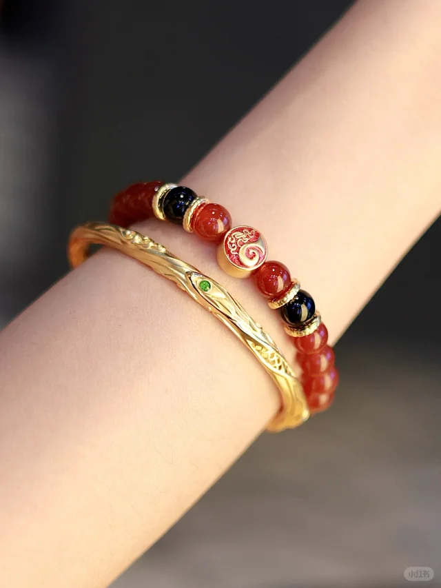 手镯的古法鎏彩工艺质感满满,手链红玉髓配黑玛瑙也是相得益彰。
