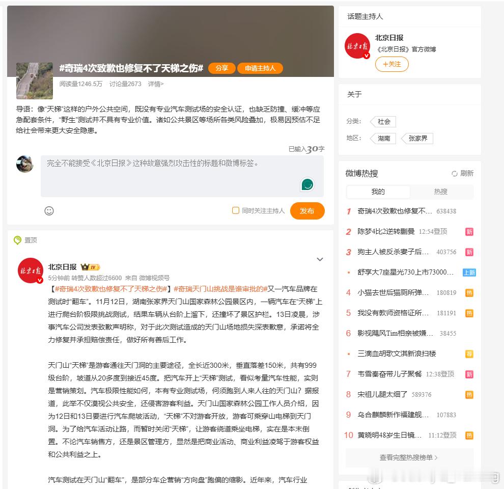 我个人完全不能接受《北京日报》的这个攻击性和迷惑性极强的标题和话题标签。天门山天梯是一个景区设施,不是文化古迹,也不是生态保护区。经过活动隔离后,更加不是什么户外公共区域,是个商业封闭测试场所。这个天梯本身就是接受商业活动的场地,不仅曾经承接过汽车爬坡活动,还经常被改造为障碍道路、跑酷设施等,例如从2022年开始的由张家界天门山景区主办、公牛极限运动承办的极限运动赛事:"云纵天梯" 跑酷大赛,把整个云梯都改造为跑酷设施,搭建跑酷设备等。期间也涉及到现有云梯设施的改建。人家极限运动无护栏无保护跑酷下山,北京日报是不是也要按照公共场所危险动作去投诉人家啊?其实我之前的微博也说过了对于奇瑞组织这次电四驱爬台阶的一些操作的观点,或许还带着一点调侃的意味。但是我绝对不能认可给车企搞真实环境测评活动,扣上所谓的危害公共安全等莫须有的大帽子。有争议我们就事论事谈合理性规范性的问题,不应该扣帽子。难道只有请媒体吃饭,对着屏幕谈感动喊口号才是车企该做的?我觉得这个明显是开始上纲上线了。说句不好听的话,《北京日报》你真的找不到可以报导的汽车新闻了嘛?