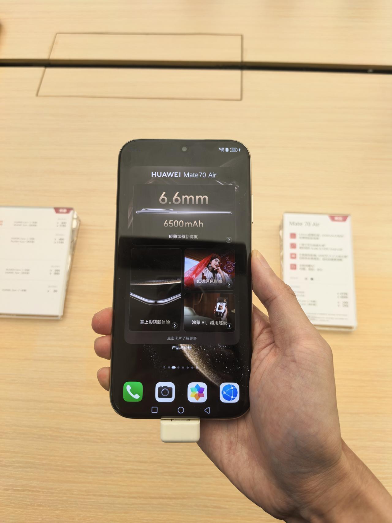 华为Mate 70 Air手感挺舒服,并不觉得重,个人认为超薄手机还是做成微弧中框和微曲屏会更优雅,手感也更好。 线下体验机一般是12GB内存,对应麒麟9020B处理器,默认“智能”屏幕刷新率,部分应用或场景下的流畅度可能会差点。手动设为高刷新率的话,整体的流畅度会好一些,另外后续升级鸿蒙6系统之后,预计性能还会提升15%。