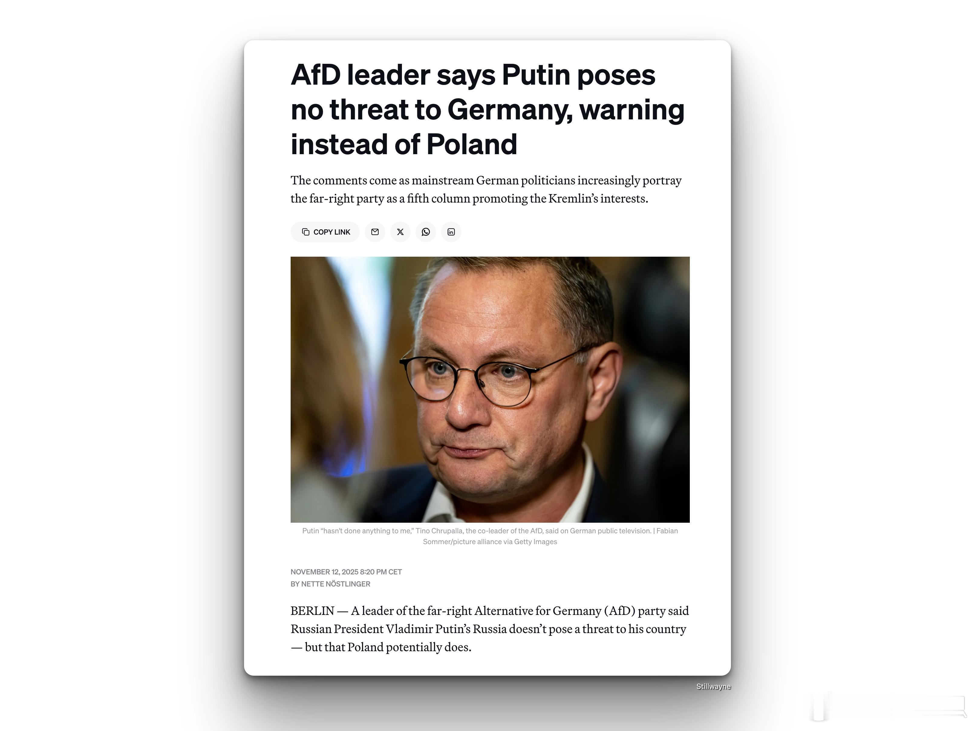 极右翼德国选择党领导人称普京对德国不构成威胁,反而波兰可能对德国构成威胁。德国极右翼政党“德国选择党”(AfD)的一位领导人表示,俄罗斯总统普京领导下的俄罗斯不会对德国构成威胁,但波兰则可能构成威胁。这些评论与克里姆林宫的宣传口径相呼应。