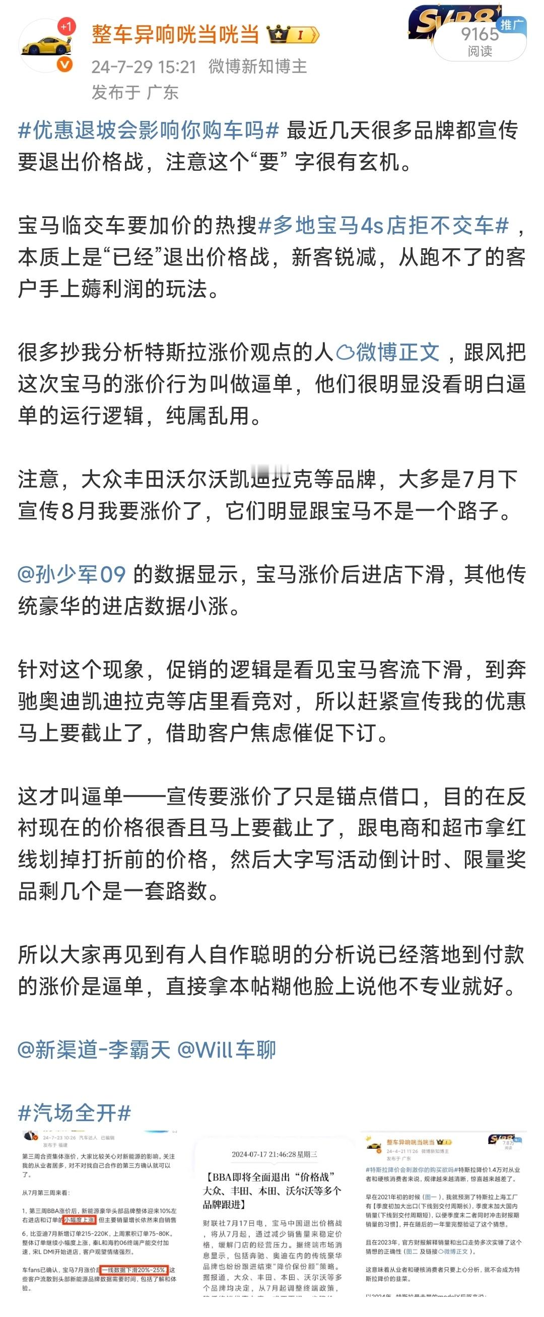 从车企运营订单-交付的角度说,没宣传兜底购置税的大概率在逼单,宣传兜底购置税的大概率是有排队。光特斯拉的逼单我都科普过四次了,还有很多人说看不懂逼单,甚至还有瞎抄,解释称逼单是涨价的,再纠正一下:商家的以下说辞:“XX优惠要截止了”,“XX紧张马上涨价了”,“明年新规导致买一样的东西要更多成本”了,有很大概率是为了催促消费者趁着还没涨价的【现在】下单,俗称再不买来不及了。强调一下,关键词是【现在】,具体跟未来什么价格并没有太大的关系。明年购置税减税额度确实会降,那么造成的明年消费者购车成本上升厂家急不急呢?急?错了,不急。当前的竞争环境容不得你想未来,【现在】怎么把这些客户抓手里才是关键。宣传兜底购置税的,大多数情况是面对消费者下订后要等交付,错过减税截止时间有顾虑的情况,安抚客户【现在】放心下单,放心等。没宣传兜底购置税的,大多数情况是逼单催促消费者【现在】就买很快能提,如果此时厂家主动宣传兜底,反而会造成这些消费者观望,或者流失到前一种情况里。所以时势造英雄,厂家宣传部宣传兜底购置税有他自己的小九九,不是宣传了就光荣的。