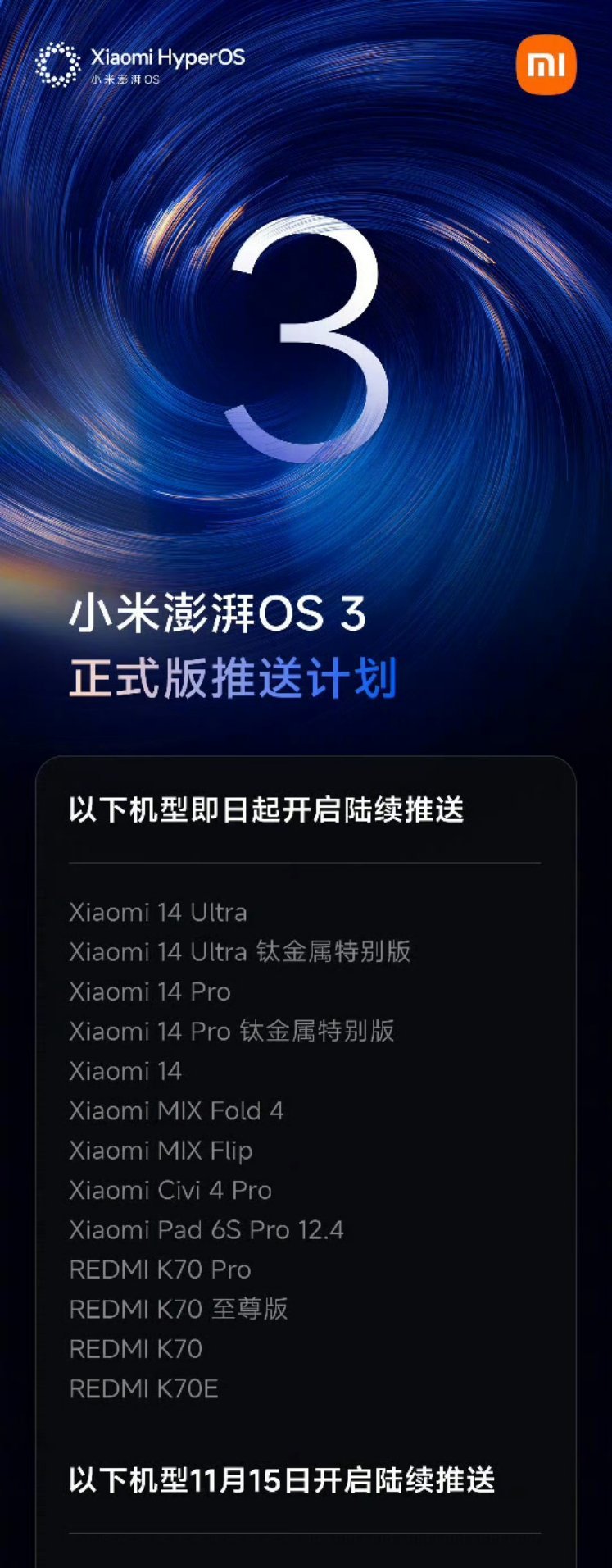 澎湃oOS3新一批推送来了!主要覆盖小米14和红米K70系列,安装包在6GB。