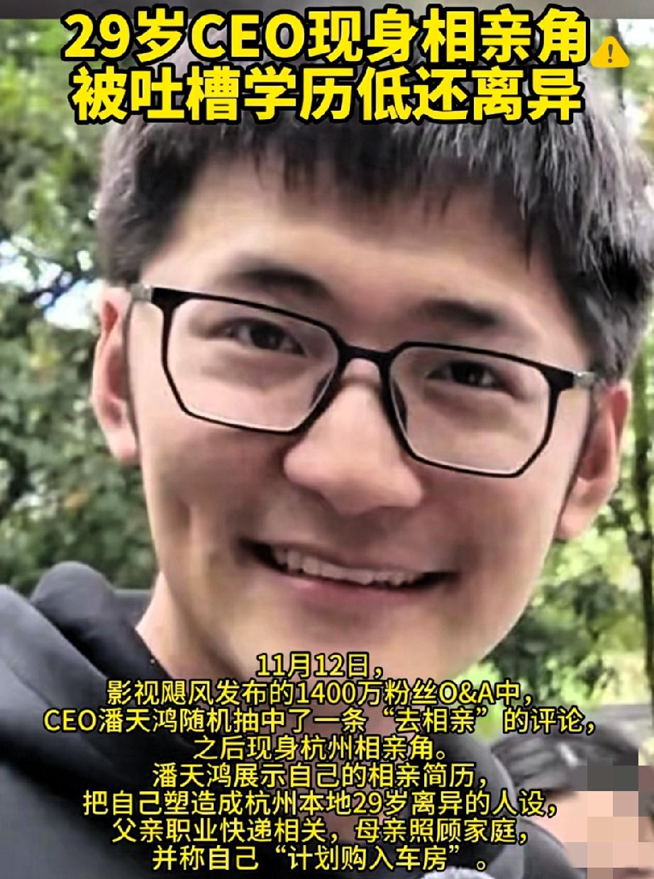 29岁年入过亿的CEO去相亲,居然被阿姨们嫌“学历低、离异”直接pass,这简直是相亲界的大型“看走眼”现场! 影视飓风的Tim(潘天鸿)应粉丝要求去杭州相亲角,简历写得坦诚:国内初中学历、29岁离异、计划购车房。 结果阿姨们一看标签就摇头,殊不知这“初中学历”是留学英国名校的低调,“离异”是和平分手的体面,背后更是年营业额过亿、全网千万粉丝的实力。 相亲市场最荒谬的就是,总爱用学历、婚史这种硬标签一刀切,却忘了真正的实力从不在纸上。 一个能白手起家打造商业版图的人,难道不比一张文凭更有价值? 比起纠结过往标签,不如看看一个人的担当和潜力啊! 你们觉得相亲时学历和能力哪个更重要?换作你会给这位CEO机会吗?来评论区聊聊~