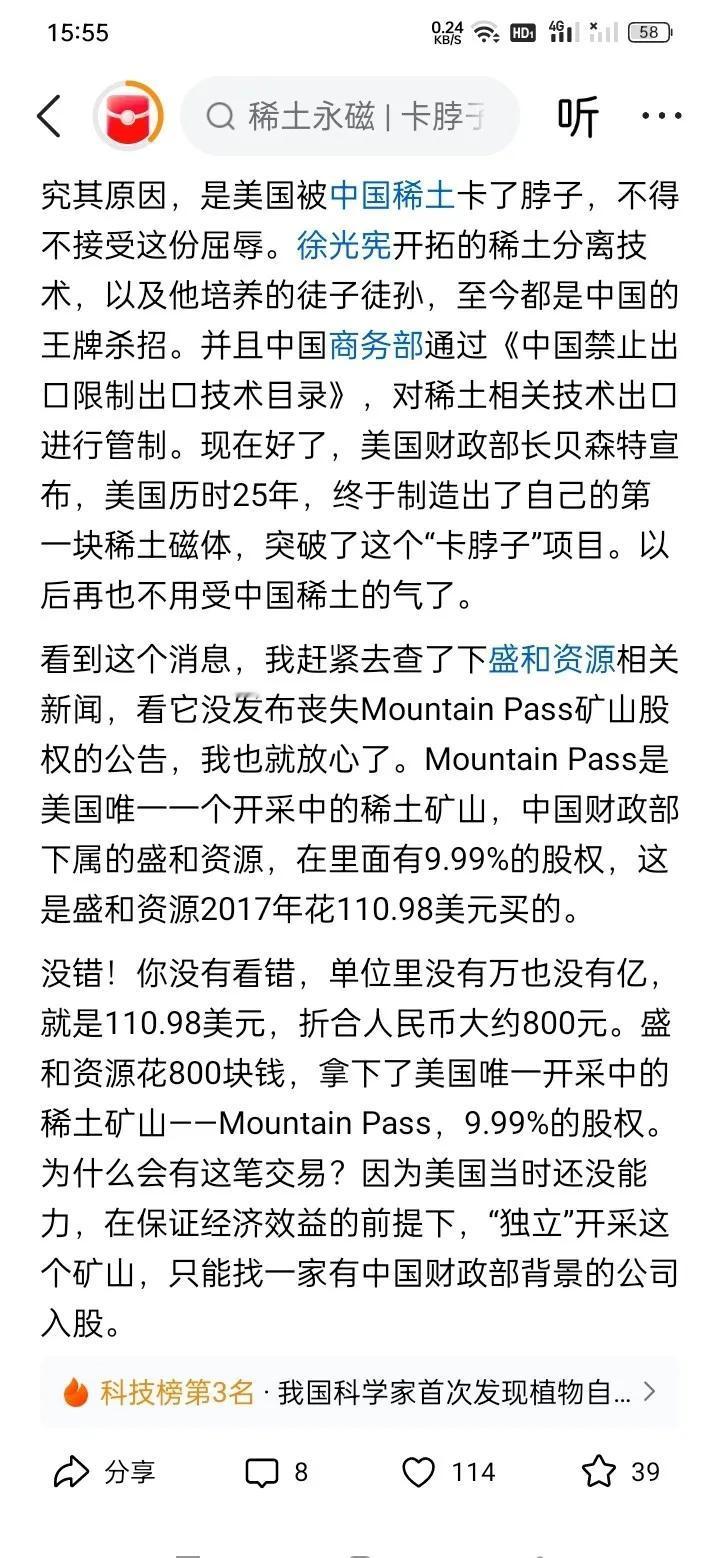 实验室造的出,工厂做不出来。因为要批量生产需要大量设备和人力资源,没有国家补贴会亏本。实验室的产品和市场化的产品是完全没可比性的,高阶芯片在中国实验室也能轻松做出来,但良率太低成本太高,距离真正实现量产还需要巨大努力。美国的高精稀土提炼也是如此。就看谁能抢先摆脱对方制约率先撞线。那需要时间和资金,就是搞出来了成本怎么样?关键现在用什么?道理同卡芯片一样,都在抢时间,不同的是成本是中国的强项。你放心,再过几年稀土就卡不到它们的脖子了。完全去工业化,都没有脖子了,还卡个毛的脖子。