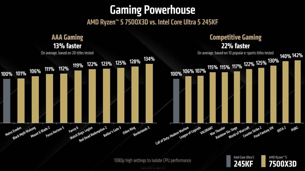 【AMD入门锐龙5 7500X3D发布】11月13日,AMD正式发布了其Zen 4架构新成员锐龙5 7500X3D,这款6核/12线程的处理器进一步扩展了其X3D芯片阵容,定位入门级游戏市场。锐龙5 7500X3D采用了3D V-Cache技术,拥有32+64MB的L3缓存,基础频率为4.0GHz,最高可提升至4.5GHz,TDP为65W,集成基于RDNA 2架构的图形核心,具备两颗GPU核心,频率达到2200MHz。 AMD还公布了其性能数据,显示在游戏性能上明显快于Intel的i5-14600K和最新的酷睿Ultra 5 245KF处理器。 对比酷睿Ultra 5 245KF:在3A游戏中平均快13%,在竞技游戏中平均快22%。 对比i5-14600K:在3A游戏中领先8%,在竞技游戏中领先12%。