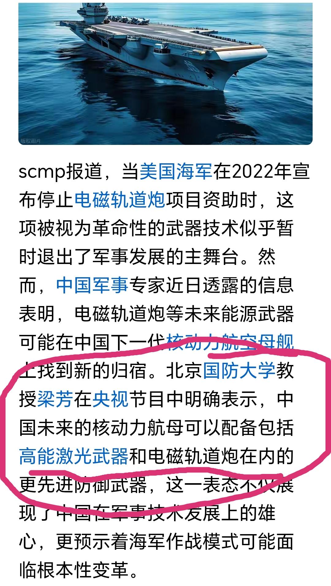 这应该是中国版“星球大战”计划吧?在我们的核动力航母上将会有六代战斗机,电磁轨道炮,激光武器……将科幻变成现实。 我们做PPT的能力不强,但是我们踏实肯干。我们做的计划不能说100%都会按时完成,但至少完成80%是没问题的。 我们取法乎上得其中,美国取法乎上……他们啥也不做[捂脸] 点右上角关注我,我们一起去看这个魔幻的世界