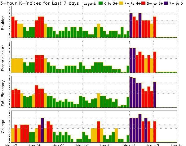 【地磁扰动达到强地磁暴水平】 【空间天气事件】 ++++++++++ !![黄]色警报!! ++++++++++ 北京时间2025年11月13日13时9分,地磁扰动达到强地磁暴水平,为KP=7 漠河地区需要留意北天夜空地平线附近可能会出现的极光,但还需要3小时平均值的监测结果 数据:NOAA-SWPC 发布时间:2025年11月13日13时24分12秒