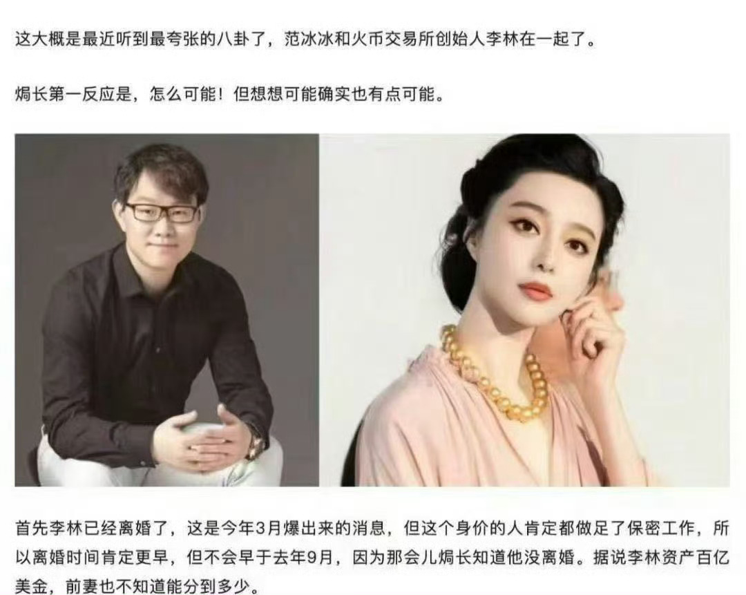 今天看到的八卦:范冰冰,嫁给火币李林(身价百亿美金)~地产周期,传的是许家印,加密周期,跟李林,概率确实不小…