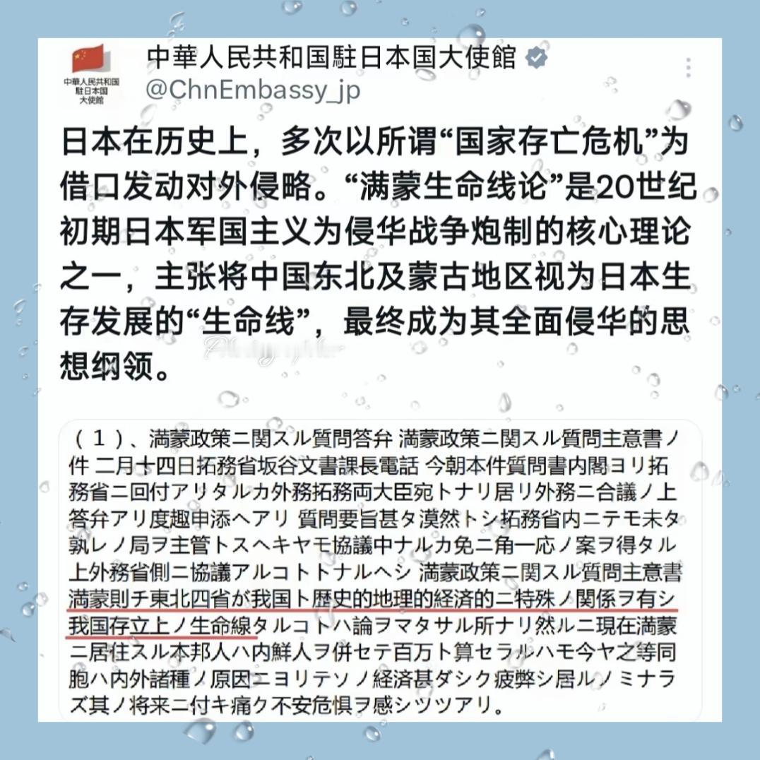 11月13号,今天中国驻日本大使馆再次发文,和前两天相比,这一次更是直接追到了高市早苗“存立危机事态”的根源上去,那就是近代日本对外扩张的三线理论,就是主权线、利益线和生命线。驻日使馆在今天的发文当中,格外强调了“生命线”的理论,它正是日本近代侵略中国东北和蒙古地区的思想根源。而它的思想逻辑,也和当前日本所提出的“存立危机事态”是一致的。 所谓的三线理论从吞并朝鲜到觊觎满蒙,再到妄图染指整个中国,这套思想逻辑与近代扩张主义一脉相承,本质是延续了带有侵略色彩的陈旧话术。高市早苗把台海塞进“存立危机事态”,绝非一时口误,背后反映出日本国内部分势力历史反思不足,延续了军国主义残留的扩张思维。 历史早就证明,对这种步步紧逼的扩张倾向,妥协只会换来得寸进尺。中国驻日使馆的明确发声,就是要戳破其伪装,让世界看清这套话术背后的真实意图。台湾问题是中国核心内政,绝不容许任何国家用陈旧的扩张逻辑说三道四。 你认为该如何理性回应这类干涉内政的言论,更好维护国家主权?欢迎在评论区留下你的看法!