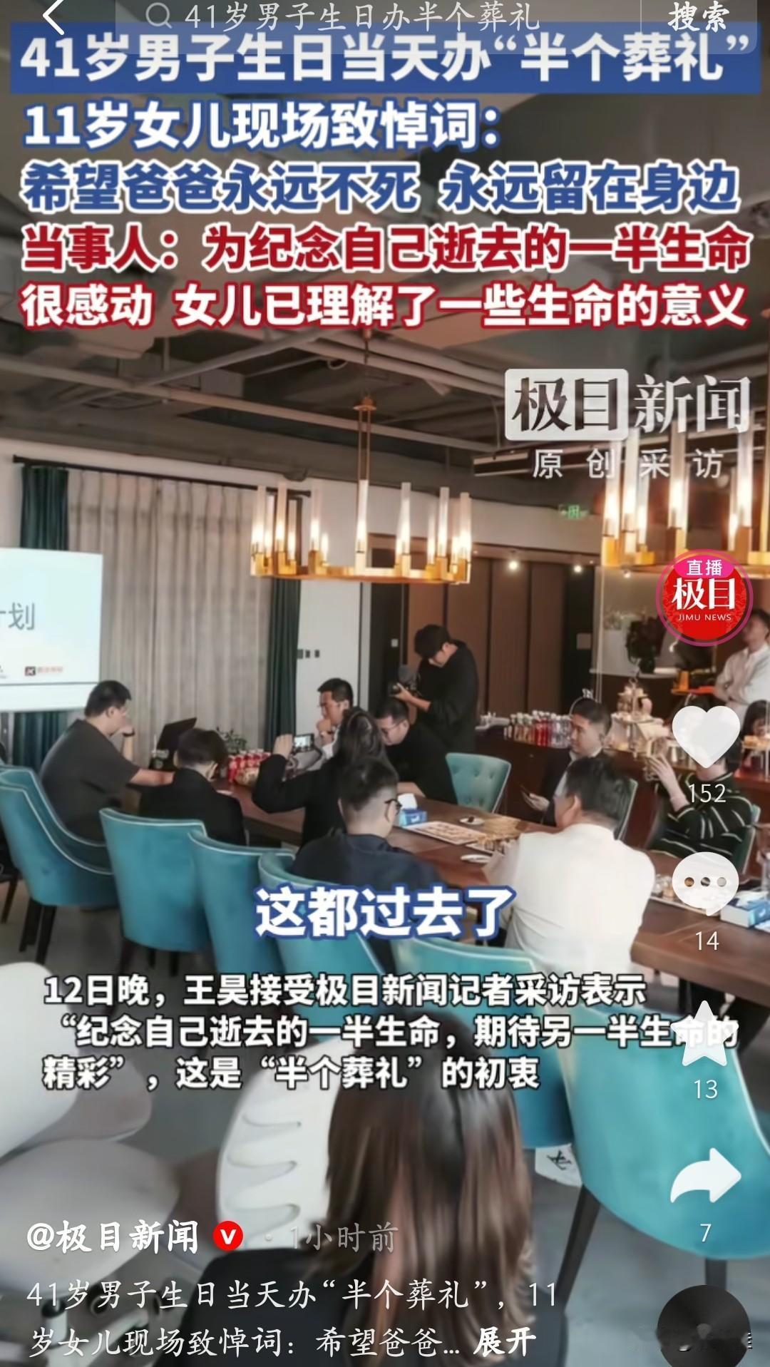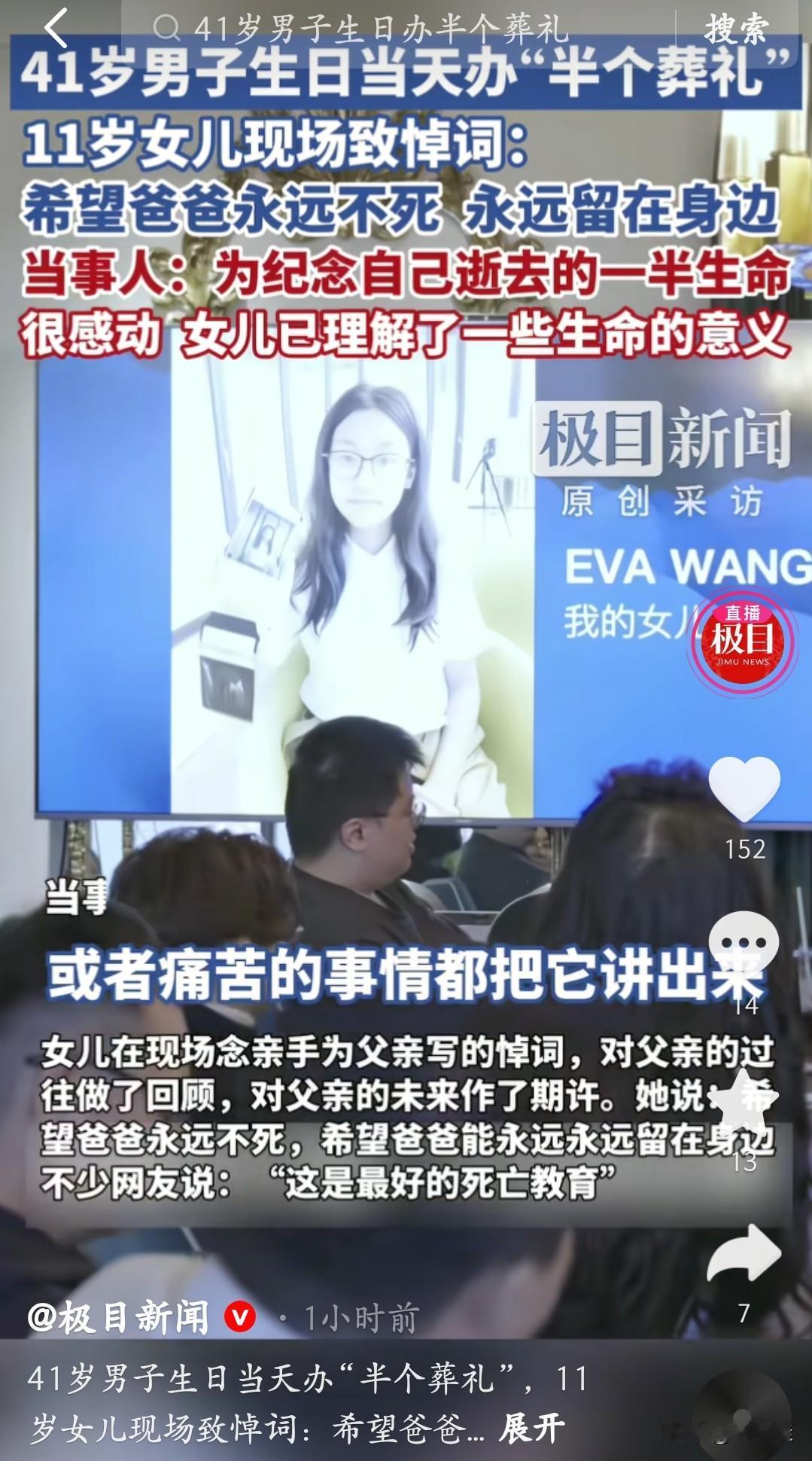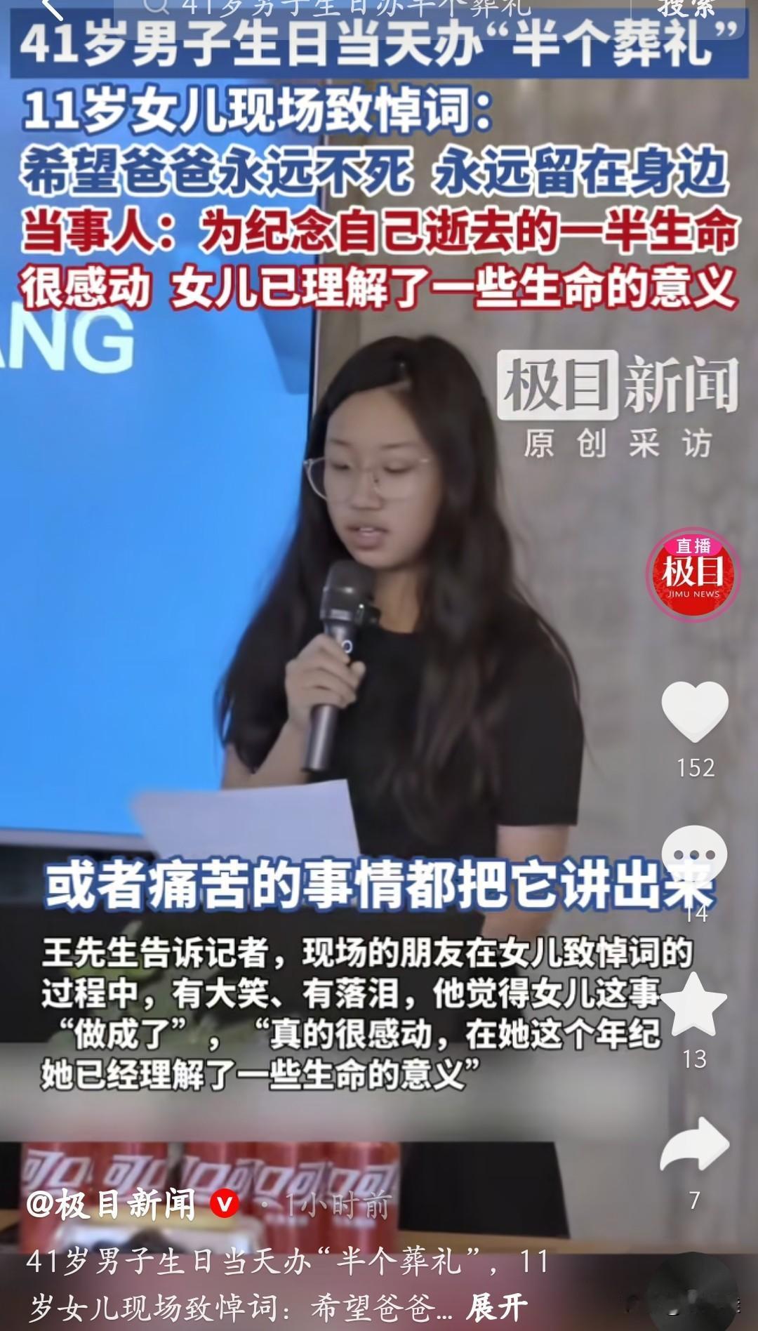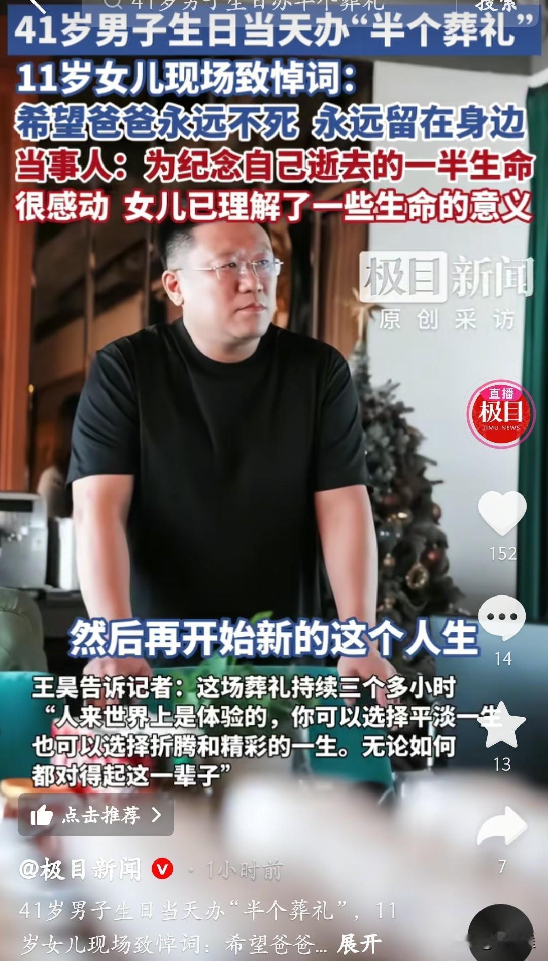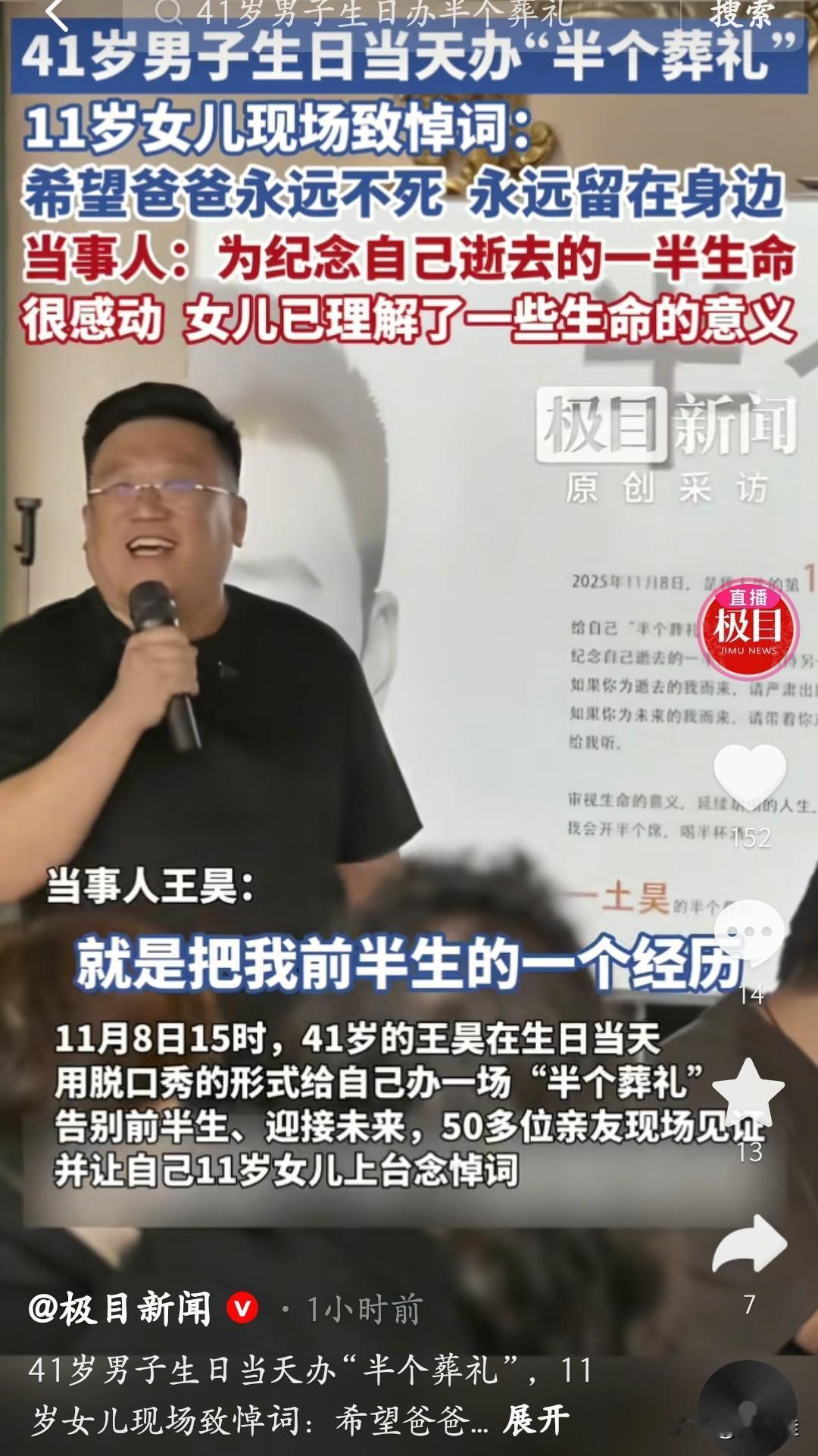 41岁大哥在生日当天办了场“半个葬礼”,不是真走了,是跟自己前半生“告别”! 50多个亲友坐台下,他用脱口秀讲完前半生的糟心事,11岁女儿拿着手写悼词上台:“希望爸爸永远不死,永远留在我身边”。 现场有人笑有人哭,大哥说这是“纪念逝去的一半生命,迎接后半段精彩”。其实就是把过去的遗憾、痛苦都摆出来,跟自己和解,再轻装上阵。 这真的是“最好的死亡教育”,活着的时候把话说透,把爱讲明白,比真到分别那天哭着后悔强多了。