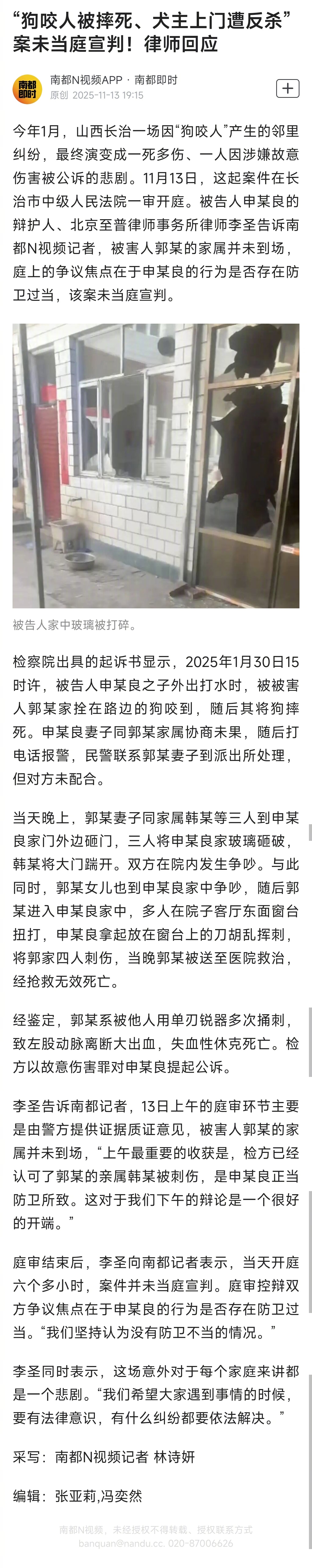 【“狗咬人被摔死、犬主上门遭反杀”案未当庭宣判!律师回应】今年1月,山西长治一场因“狗咬人”产生的邻里纠纷,最终演变成一死多伤、一人因涉嫌故意伤害被公诉的悲剧。11月13日,这起案件在长治市中级人民法院一审开庭。被告人申某良的辩护人、北京至普律师事务所律师李圣告诉南都N视频记者,被害人郭某的家属并未到场,庭上的争议焦点在于申某良的行为是否存在防卫过当,该案未当庭宣判。检察院出具的起诉书显示,2025年1月30日15时许,被告人申某良之子外出打水时,被被害人郭某家拴在路边的狗咬到,随后其将狗摔死。申某良妻子同郭某家属协商未果,随后打电话报警,民警联系郭某妻子到派出所处理,但对方未配合。当天晚上,郭某妻子同家属韩某等三人到申某良家门外边砸门,三人将申某良家玻璃砸破,韩某将大门踹开。双方在院内发生争吵。与此同时,郭某女儿也到申某良家中争吵,随后郭某进入申某良家中,多人在院子客厅东面窗台扭打,申某良拿起放在窗台上的刀胡乱挥刺,将郭家四人刺伤,当晚郭某被送至医院救治,经抢救无效死亡。经鉴定,郭某系被他人用单刃锐器多次捅刺,致左股动脉离断大出血,失血性休克死亡。检方以故意伤害罪对申某良提起公诉。李圣告诉南都记者,13日上午的庭审环节主要是由警方提供证据质证意见,被害人郭某的家属并未到场,“上午最重要的收获是,检方已经认可了郭某的亲属韩某被刺伤,是申某良正当防卫所致。这对于我们下午的辩论是一个很好的开端。”
