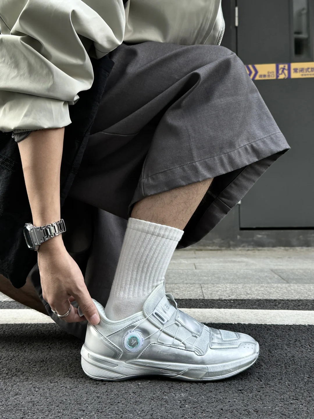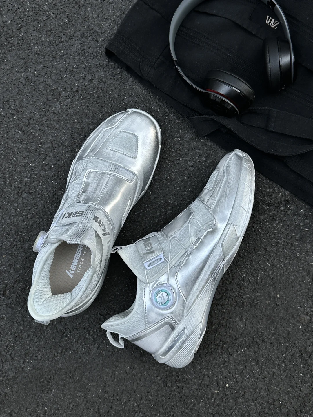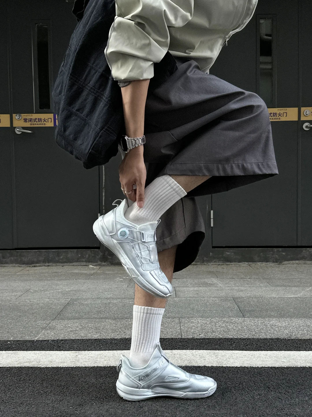 这双羽毛球鞋直接把“运动感”和“未来感”焊在鞋上了! 鞋面不是单调的银,是手工做旧的渐变肌理, 阳光下会透出细碎的光泽,呈现出独特的星际渐变效果,比普通黑白球鞋吸睛亿点点。 中帮袜套设计不压脚踝,还能悄悄显腿直,加上侧边金属质感的旋钮扣,细节感直接拉满。 这双不仅是适合运动的功能鞋,时尚属性这块也是点满了
