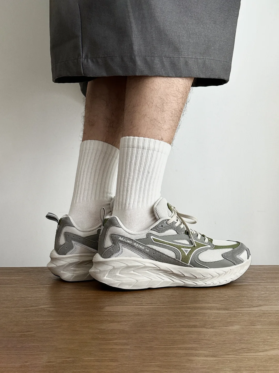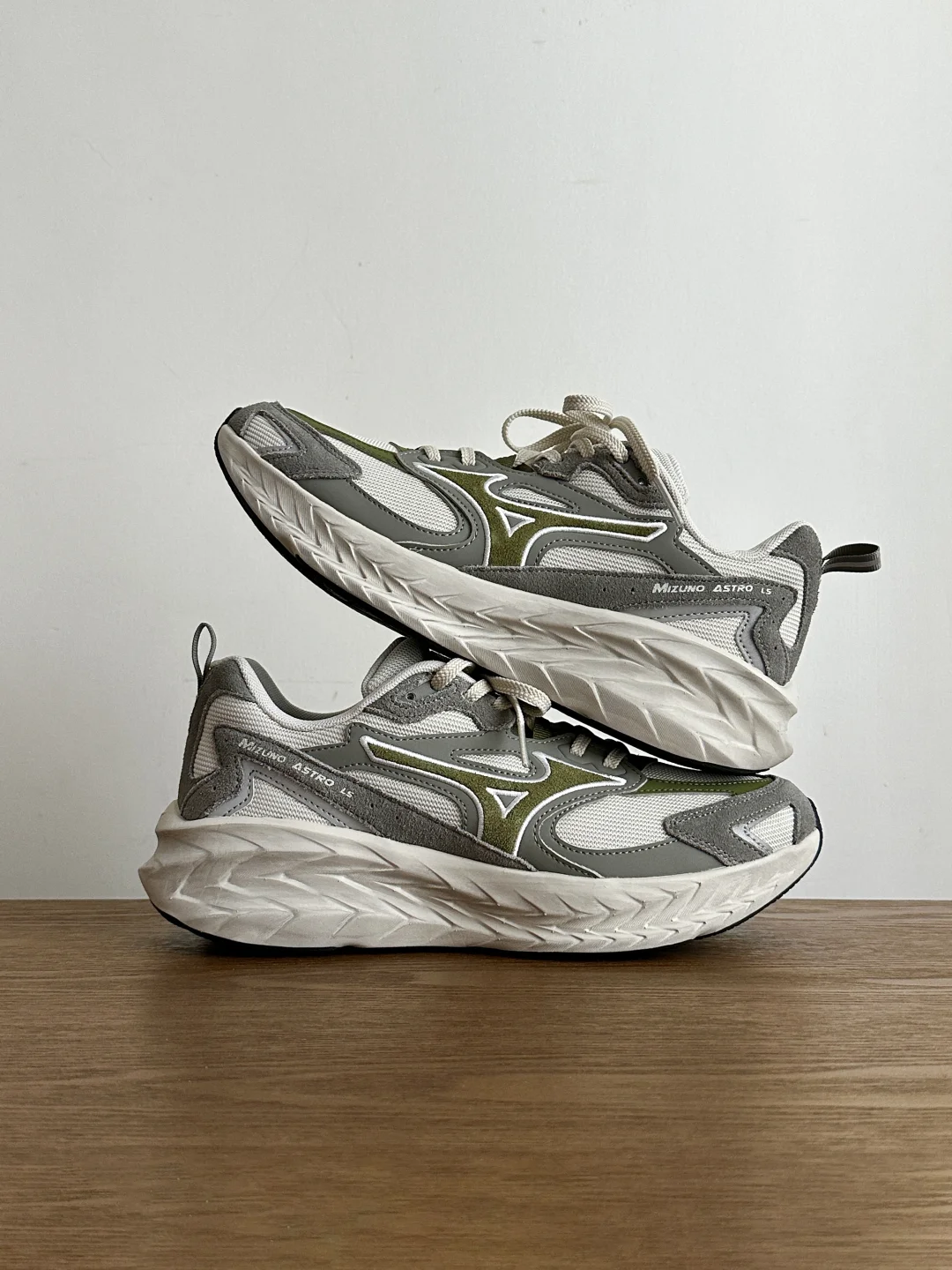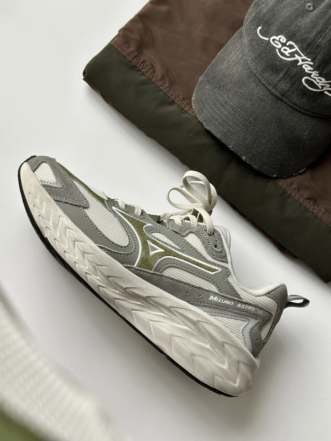 美津浓ASTRO LS这双鞋简直是秋日温柔暴击! 低饱和灰调自带朦胧高级感,像给脚踝套了层秋日薄雾!! 脚感惊艳到词穷!中底采用EVA轻质发泡,4CM的厚度轻松增高,踩下去很柔软回弹有韧劲,暴走一天膝盖毫无压力!秋风穿行时不闷不灌风,温感平衡拿捏得恰到好处。 低饱和的灰绿配色很温柔,特别适合秋天citywalk 通勤遛狗、晨跑爬山全能扛,真正实现“一鞋穿三季”。