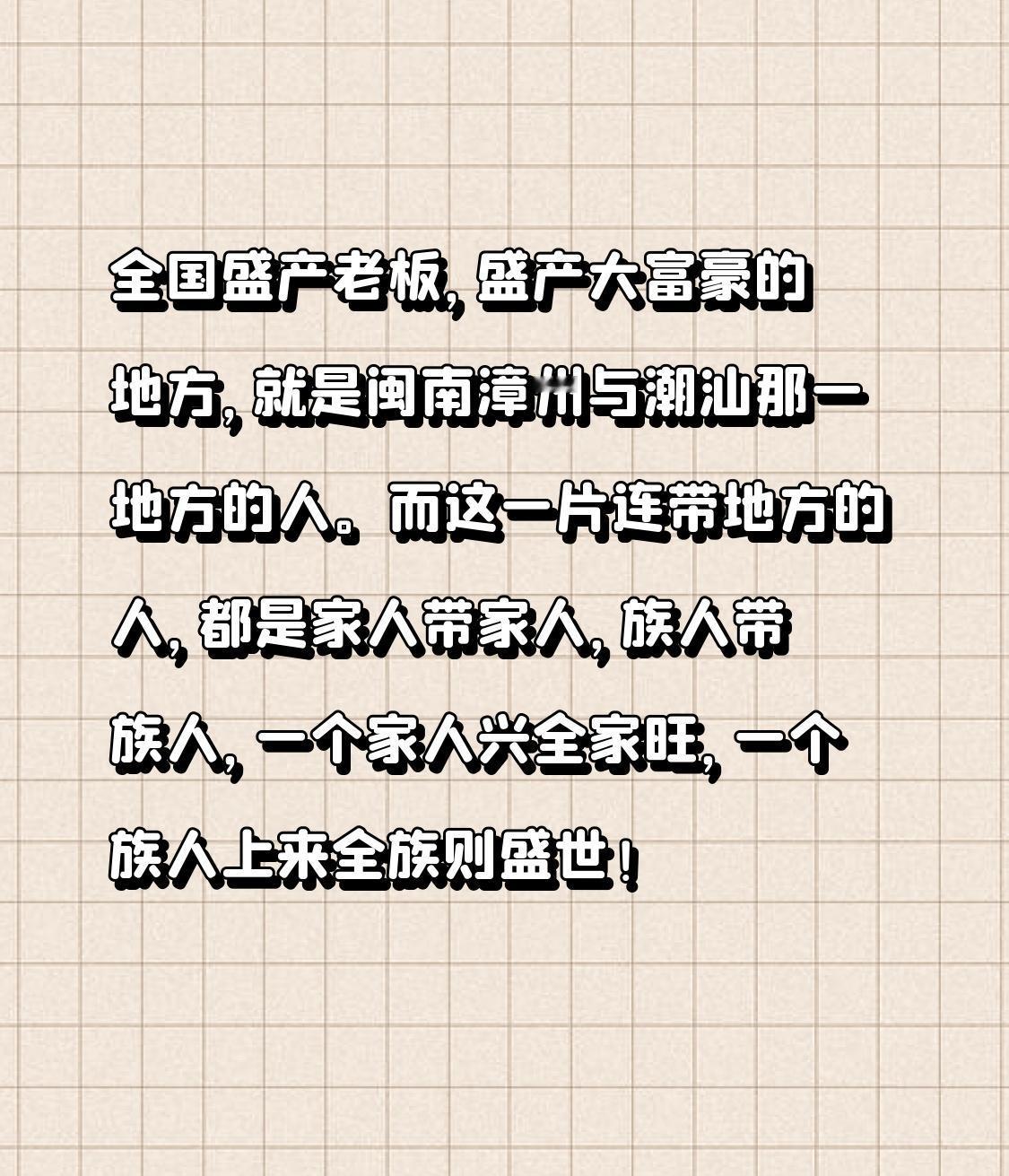 全国盛产老板、大富豪的地方,当属闽南漳州与潮汕地区。 这一片区域的人,都是家人引领家人,族人带动族人,一人兴旺则全家昌盛,一族崛起则全族繁荣! 而这一带地方的人应该是咱中国最团结互助的群体! 这一带人的商业头脑可不是一般地方人可匹敌的!