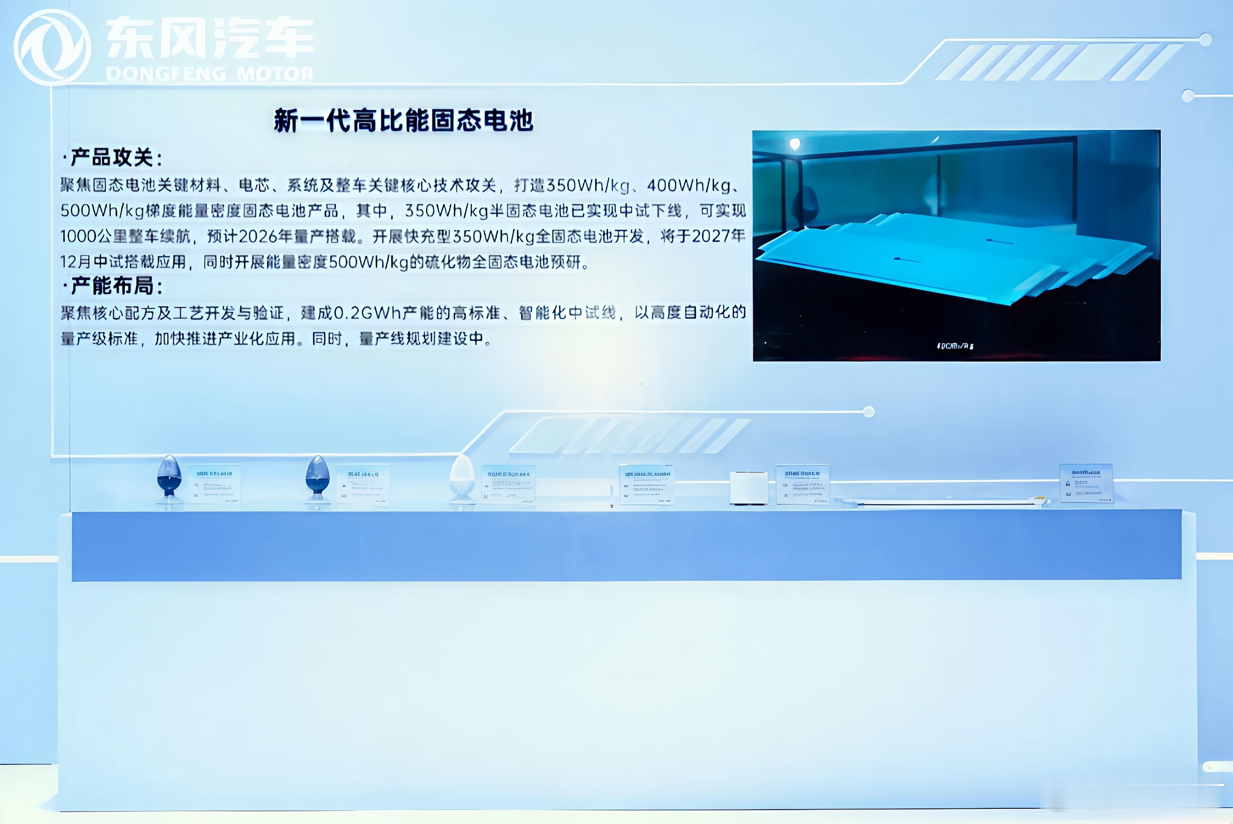 东风汽车在2025世界动力电池大会上展示了新一代全自主高比能固态电池和1200V超高压纯电平台马赫超千伏纯电平台,具有能量密度达350Wh/kg,可在-30°C环境下的能量保持率为72%以上,安全性好,将2026年9月正式量产上车。