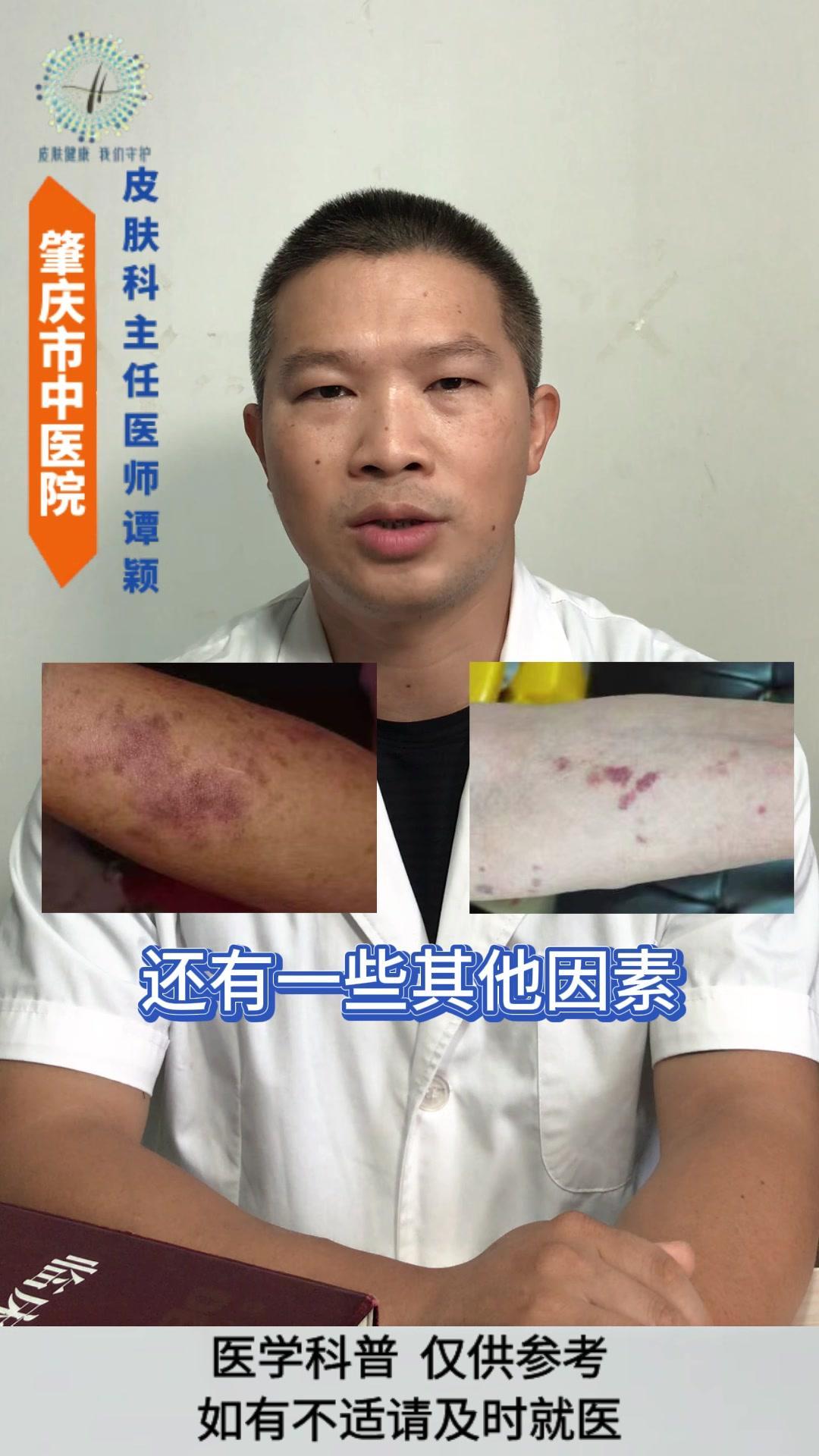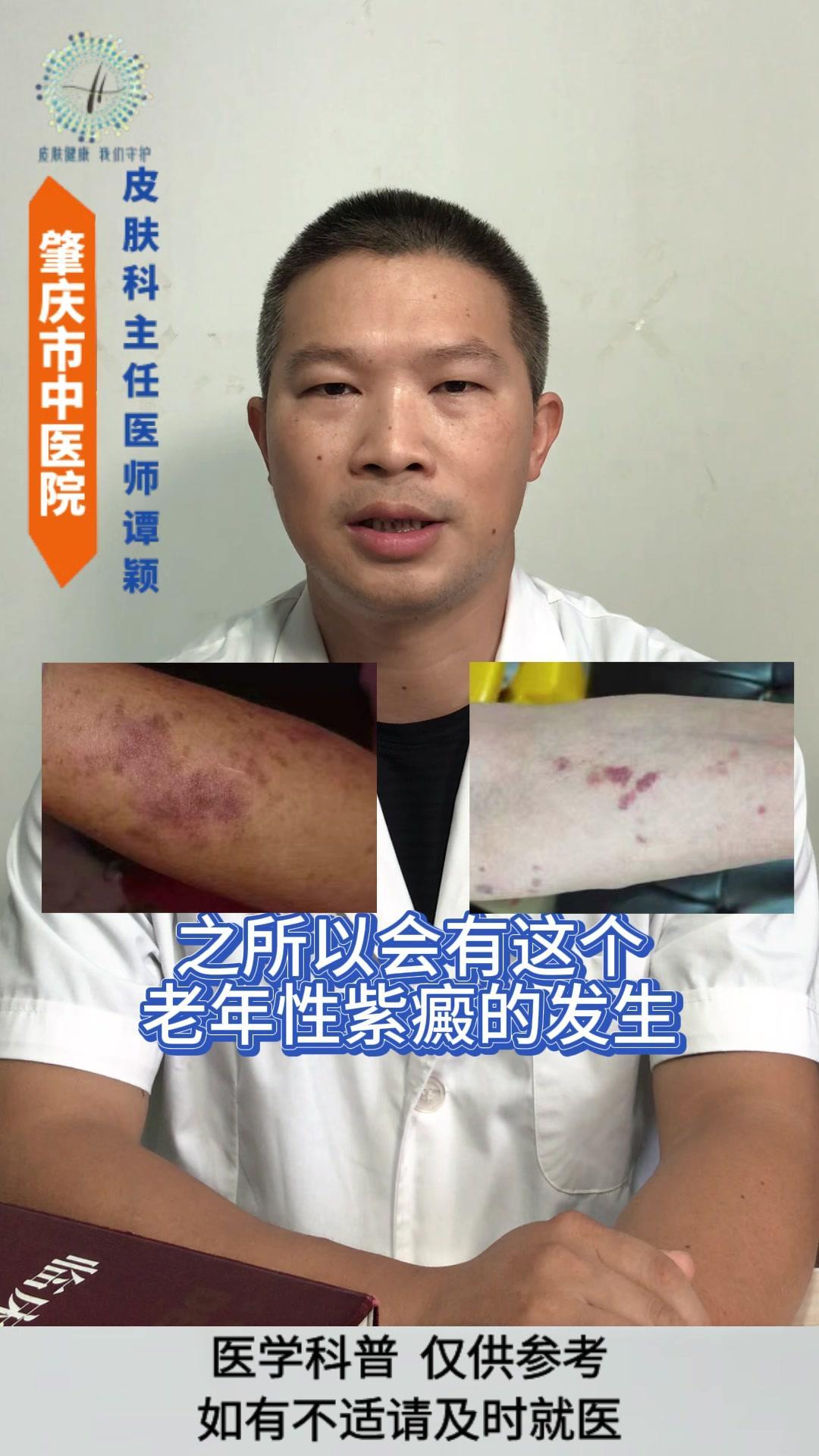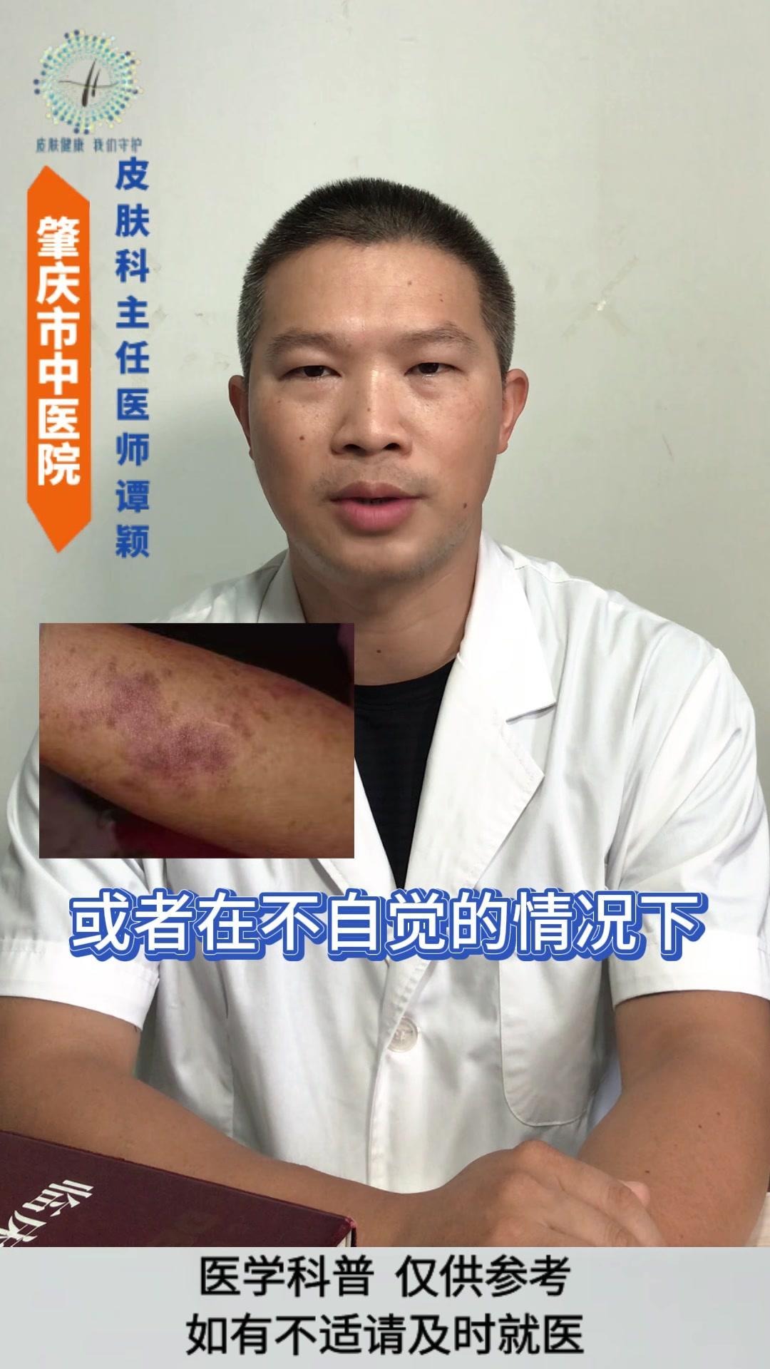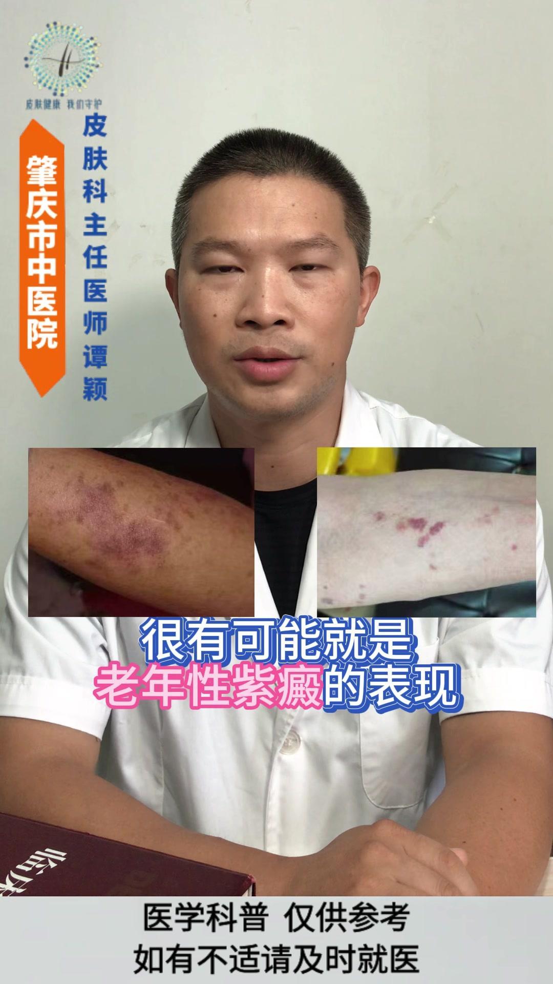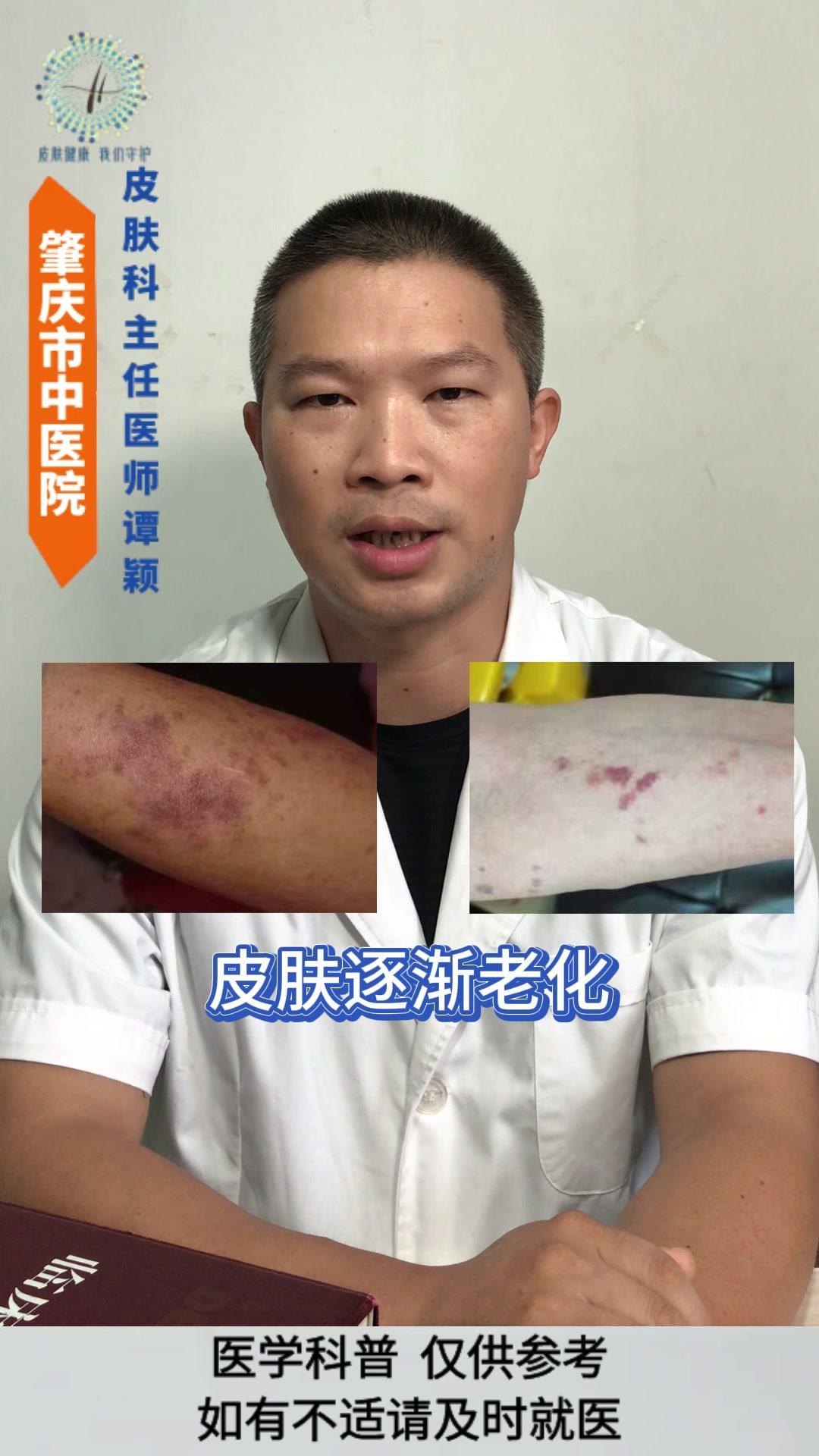 💡老年性紫癜: 皮肤尤其是四肢暴露部位的皮肤,容易在磕碰、烧抓或压力挤压后,出现紫红色瘀斑瘀点,一般没有疼痛感,一两个月后会慢慢消退,但容易反复出现。 💡发生原因: 与皮肤以及血管的老化有着密切的关系。 1️⃣随着年龄的增长,皮肤逐渐老化,真皮层中的胶原蛋白和弹性纤维减少,使得皮肤逐渐变薄,保护作用逐渐减弱。 2️⃣血管的老化会导致皮下小血管壁变薄脆弱,受到轻微的外力刺激就容易破裂。 3️⃣过度的暴晒破坏皮肤中的胶原蛋白和血管,导致皮肤加速老化。 4️⃣某些药物可能会增加血管的脆性。 5️⃣某些营养缺乏的情况也会影响血管的强度。 💡影响: 皮肤老化的自然表现,不是严重的疾病,但可能会影响皮肤外观和心理健康。 💡注意事项: 1️⃣注意保护好皮肤,减少外伤。 2️⃣注意做好皮肤的保湿护理和避晒工作,不要用热水烫洗皮肤,也不要过度的清洁皮肤。 3️⃣注意科学营养的饮食搭配,避免过度忌口。 老年性紫癜 皮肤老化 健康科普 皮肤病