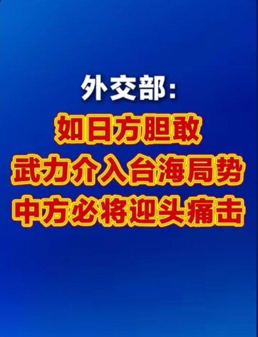 外交部回应“如日方胆敢武力介入台海局势,中方必将迎头痛击”。 2025年11月13日,中国外交部例行记者会上,有外媒记者提问:“日本防卫大臣称‘台湾有事即日本有事’,并表示将加强与美军联合应对台海局势。中方对此有何评论?” 外交部发言人林剑回应如下:“台湾问题纯属中国内政,不容任何外部势力插手。日方有关言论严重违背中日四个政治文件原则,粗暴干涉中国内政,违背一个中国承诺,中方对此强烈不满、坚决反对,已向日方提出严正交办。” 林剑表示:“如日方胆敢以任何形式武力介入台海局势,挑战中国国家主权和领土完整,中方必将迎头痛击,坚决捍卫国家主权、安全和发展利益”。 林剑称:“我们正告日方,立即停止在台湾问题上玩火,停止挑动阵营对抗,否则只会自食苦果,搬起石头砸自己的脚。” 日本防卫大臣滨田靖一11月12日在香格里拉对话亚洲安全峰会期间表示,“台湾海峡稳定对日本安全至关重要”,并重申“台湾有事就是日本有事,也是日美同盟有事”。日美近期升级“2+2”会谈,明确将台海纳入联合防卫范围。 中方强硬定调, 首次使用“迎头痛击”表述,较以往“坚决反制”更具军事威慑意味。直接点名“武力介入”为红线,暗示不排除对日采取非和平手段。 中方此轮表态不仅是对日警告,更是对美日同盟的战略敲打。结合近期东部战区多军种绕台演训,显示“以武止独”与“以武拒外”并行策略。