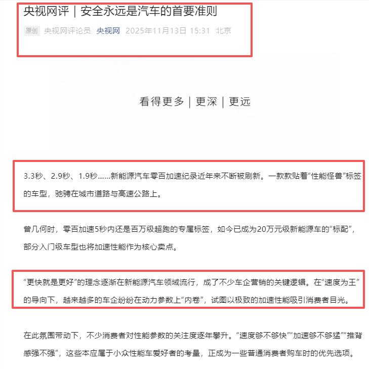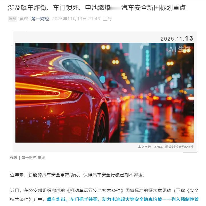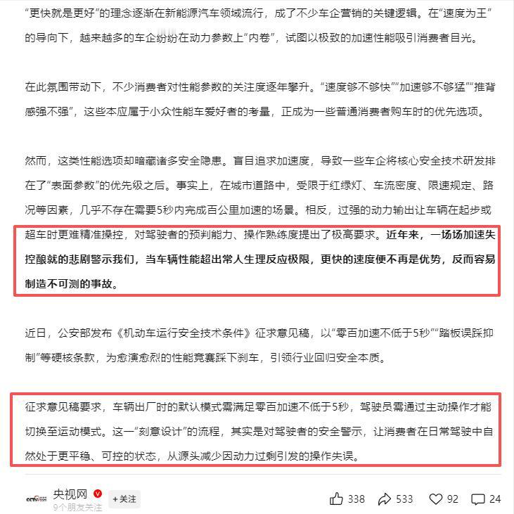 “速度不再是信仰”,央视发网评:“安全是首要准则”! 基本上是定调了,新能源汽车零百加速要限制,新国标征求意见稿,百公里加速时间要大于5秒,央视网也发了网评:安全永远是汽车的首要准则! 划重点:安全技术、驾驶辅助系统、车身结构这些才是核心技术… 最近某新能源汽车频繁的出事故,这次国标新也算是进一步规范新能源汽车行业,不能一味追求速度与激情,更应注重安全性能。新国标的实施,将倒逼车企提升安全技术。
