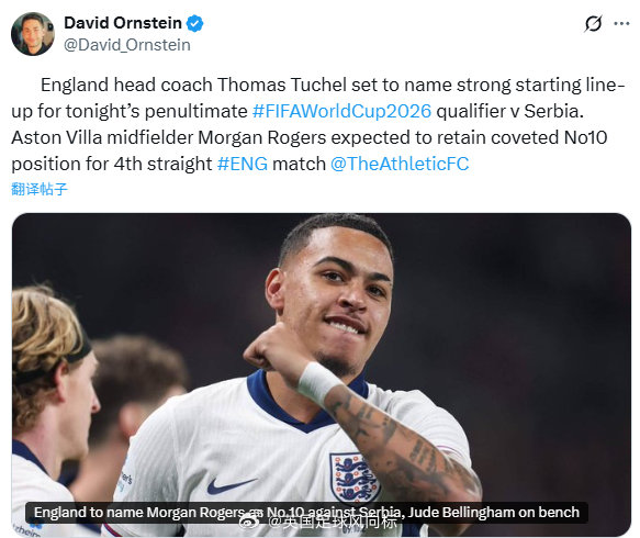【图赫尔的头号爱将】TA名记DO爆料:尽管已经提前晋级2026世界杯,英格兰主帅图赫尔依然会派出强大的首发阵容,出战对阵塞尔维亚的世预赛,维拉中场摩根罗杰斯将会连续四场国家队比赛,出现在10号位,这个位置的竞争对手包括贝林厄姆、福登、吉布斯-怀特以及受伤的帕尔默。