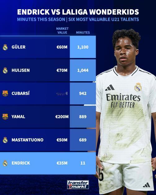 巴西新星恩德里克本赛季在皇马只出场了11分钟,继续这样下去他参加明年世界杯的梦想将会破灭,所以他必须在这个冬窗做出选择! 恩德里克被认为是近几年巴西最有天赋的天才之一,去年他正式加盟皇马,上个赛季只首发出场了8场比赛,实际角色定位为替补!巴西人首个赛季为皇马出场37次,但总共只有847分钟,在这有限的上场时间里,他打进了7个进球,这代表着一个不错的回报!但本赛季初他的伤病让他本就不多的上场时间变得更加有限,截至目前他只踢了11分钟的比赛! 恩德里克在皇马的职业生涯不可避免的在一月份到达一个十字路口,他面临着一个关键的决定。这位19岁的巴西球员决心在世界杯前重新赢得代表巴西队出场的机会,但如果他继续在皇马担任替补,他的梦想将不会实现。 切尔西是最新和恩德里克联系在一起的俱乐部,有报道说切尔西可能会在一月份引入恩德里克。然而,里昂是最接近巴西人的俱乐部,因为他们可以为恩德里克提供稳定的一线队出场时间,这正是恩德里克最想要的东西。