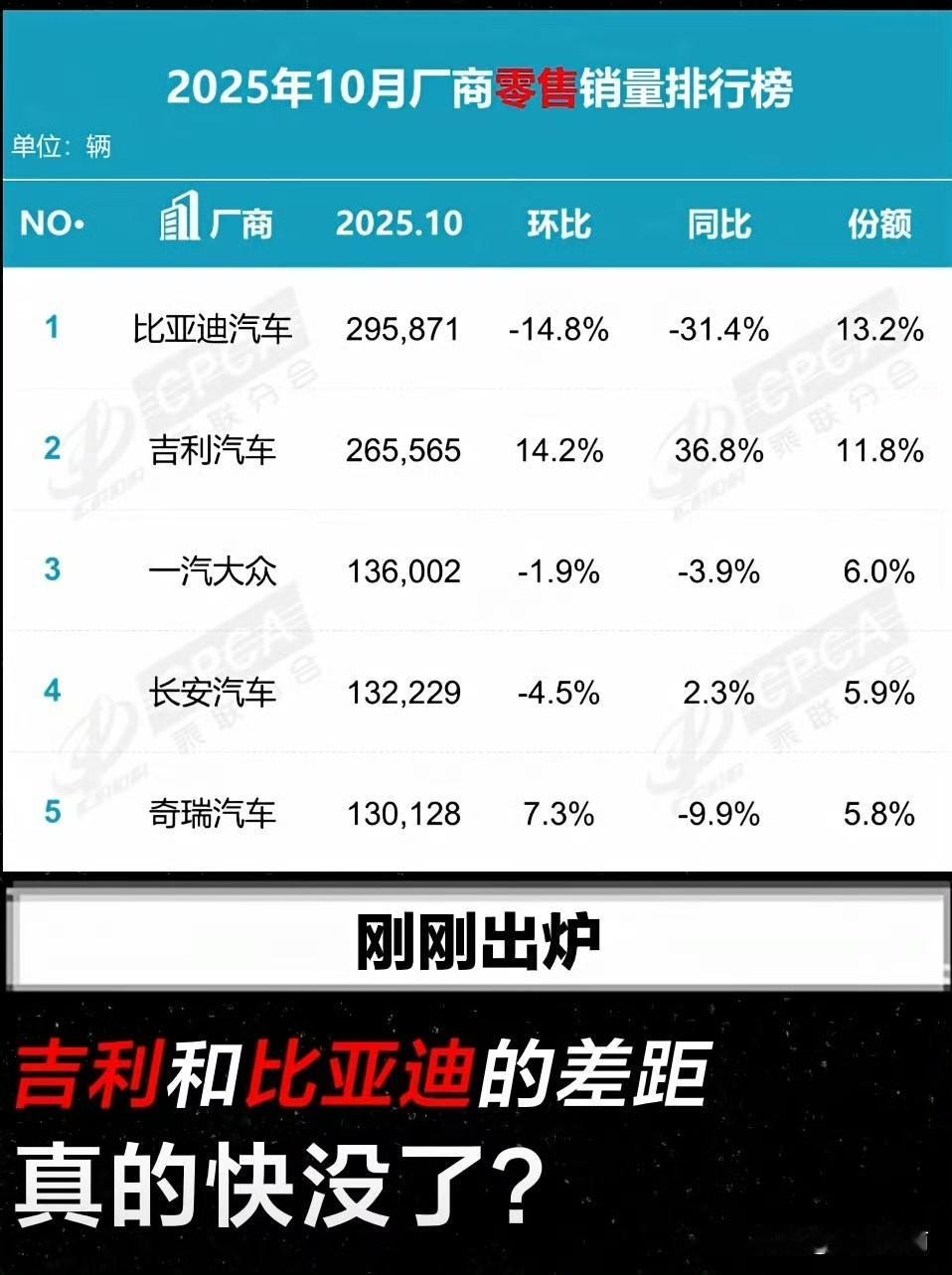 这是真的吗?差距只有3万台了! 一个是同比下降了31.4%,一个是同比增长了36.8%,大家觉得吉利下个月能超越比亚迪吗? 比亚迪这边,虽然还是老大,但增速明显放缓,加上目标下调,难免让人觉得“压力山大”。不过瘦死的骆驼比马大,比亚迪的技术底蕴和渠道基础还在,只是现在遇到了吉利这样的“狠角色”,才显得竞争格外激烈。 说真的,以前总觉得比亚迪的冠军宝座稳如泰山,现在吉利靠着新能源转型和技术创新,硬生生追成了“贴身肉搏”。这就是中国车市的魅力啊,没有永远的王者,只有不断的逆袭!