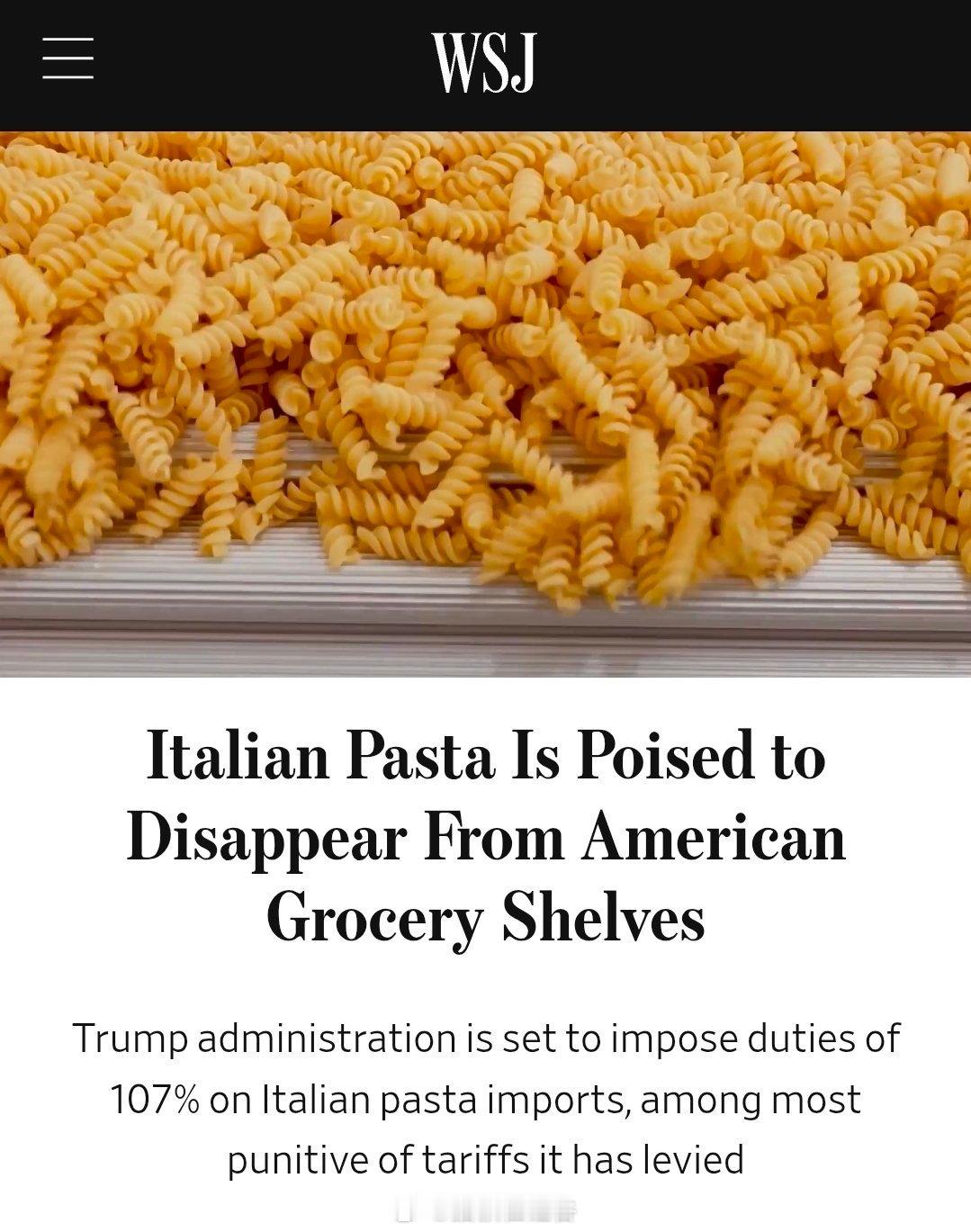 。。。我得囤一批意面。梅洛尼都没和大统领求个情?搜了下,2025年9月,美国商务部初步裁定对13家主要意大利面食生产商征收91.74%的反倾销关税,加上现有的15%欧盟商品基准关税,总关税率将达到107%。去年意大利对美国出口pasta才七亿欧元。