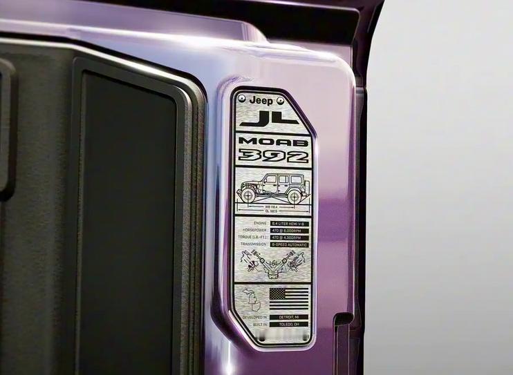帅不帅?Jeep品牌发布了牧马人Moab 392官图。 为庆祝Jeep品牌85周年以及Easter Jeep Safari(Jeep品牌每年在美国犹他州摩押(Moab)举办的越野大会)60周年,近日官方发布了牧马人Moab 392官图,该车将会搭载经典的6.4升Hemi发动机,最大功率为470马力。 目前新车已经在北美市场开启预订,起售价79995美元(约人民币57万元)。 牧马人Moab 392采用车身同色的硬顶设计,发动机盖上配备有进气口并同样采用车身同色设计,而在前后包围、轮眉以及拖车钩等处则是通过黑色形成撞色设计。另外其还会配备岩石导轨(钢制侧踏板)、17英寸轮圈以及35英寸全地形轮胎等等。 车内配备黑色Nappa真皮座椅、12.3英寸娱乐屏以及Alpine音响系统等等,用户还可选装Sky One-Touch电源顶部、3632公斤WARN绞盘和全天候地垫。 动力方面,新车将会搭载6.4升Hemi发动机,最大功率470马力,峰值扭矩636牛·米,传动系统匹配8速自动变速箱,并提供4.56轴比和2.72:1减速比的全时四驱四驱系统。 点个关注吧!汽节车社,车圈热点资讯每日一扫清!【来自懂车帝车友圈】