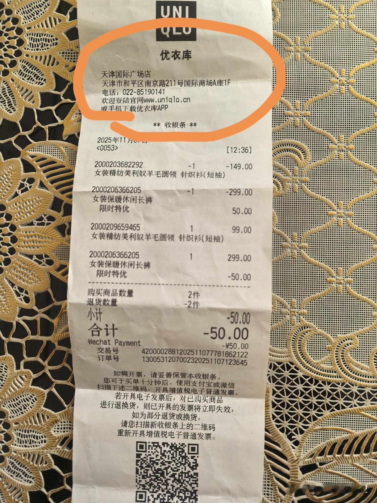 我在天津优衣库买的美利奴短袖羊毛衫,浅咖色的不太喜欢,是不是可以在青岛优衣库调换喜欢的颜色呢? 11月7日我在天津旅游,参观完西开教堂后,教堂的对面就是优衣库,它坐落在和平区南京路211号国际商场A座1楼。 我看好了两件衣服: 一件是女装保暖休闲长裤,原价299元,现价249元; 另一件是女装精纺美利奴羊毛圆领针织短袖衫,原价149元,现价99元。 当时,我选好了去结账的时候,工作人员告诉我,原来我选中的那件紫色短袖衫不在打折范围内。 无奈,我只好选了那件浅咖色的,因为这种颜色是打折的。 商场当时把这两种颜色的衣服放在一起,我没有看清楚,误认为我喜欢的紫色也打折呢! 回到青岛后,我去凯德优衣库看到这件美丽奴羊毛圆领针织短袖衫正巧打折,而且还有我喜欢的紫色。 我去咨询工作人员:我11月7日在天津优衣库买的浅咖色的短袖圆领衫,是否可以在这里换一件紫色的呢? 回答:只要价钱一致,是可以兑换的。 我一听很高兴,但遗憾的是,紫色的没有我穿的号码了。 我请工作人员帮忙查一下其他的优衣库有没有我穿的号? 工作人员很热情地帮我查了,告诉我:青岛李村伟东乐客城店还有三件紫色的一我穿的XL号。 今天我到李村伟东乐客城优衣库很顺利地把浅咖色换成了紫色。 小结:这一次通过可以跨城市调换衣服,优衣库在我心目中又提升了一个高度。 我喜欢优衣库的衣服,它的性价比高,穿着舒适,而且还能跨城市调换衣服,真是太好了!