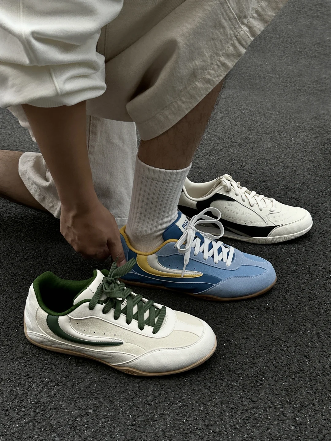 众所周知今年的关键词是薄底鞋 今天它来了 FILA的这款薄底鞋真的触动了我的DNA 加宽前掌的设计更贴合亚洲人脚型 时髦同时保证舒适 久穿不累 侧面简约流畅的线条能让你的脚型看起来更修长 不同材质的拼接鞋面细节把控的也很到位 配色方面如果你喜欢简洁一点就选白绿配色更百搭 不过蓝色的这双也是真抢眼非常有个性 在同质化严重的薄底鞋里 FILA真的做到了不一样