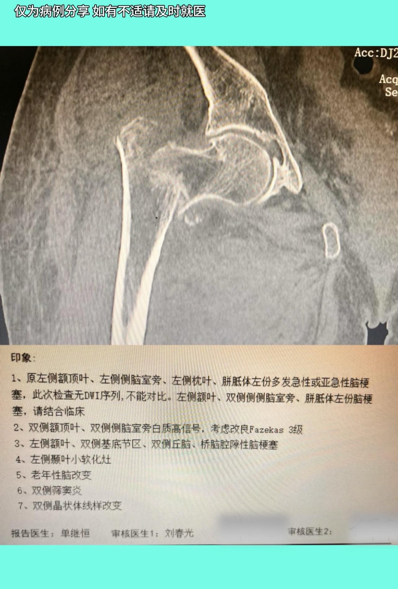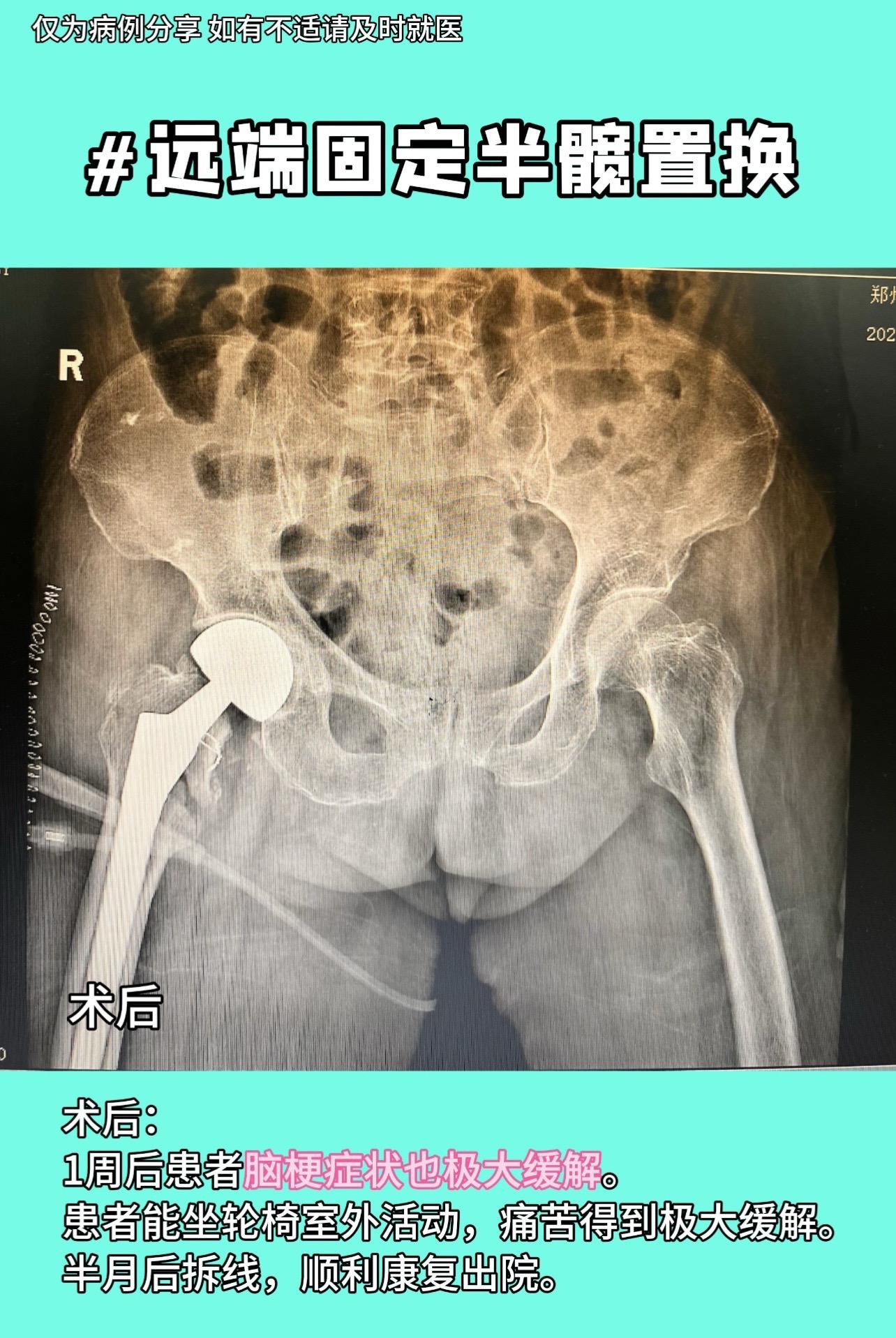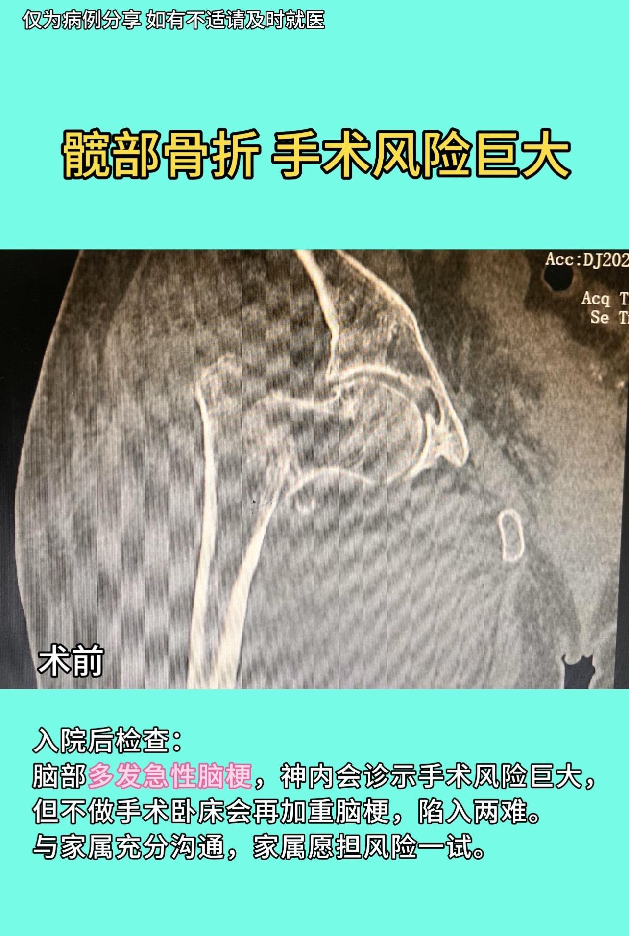 96岁老人,摔倒髋部骨折,手术风险巨大,县医院市医院建议转院。入院后检查:脑部多发急性脑梗,神内会诊示手术风险巨大,但不做手术卧床会再加重脑梗,陷入两难。与家属充分沟通,家属愿担风险一试。麻醉采用局部神经阻滞➕腰麻,仅麻醉准备就2个半小时,手术采用远端固定半髋置换。手术时间约1小时,术后积极治疗脑梗,1周后患者脑梗症状也极大缓解。患者能坐轮椅室外活动,痛苦得到极大缓解。半月后拆线,顺利康复出院。