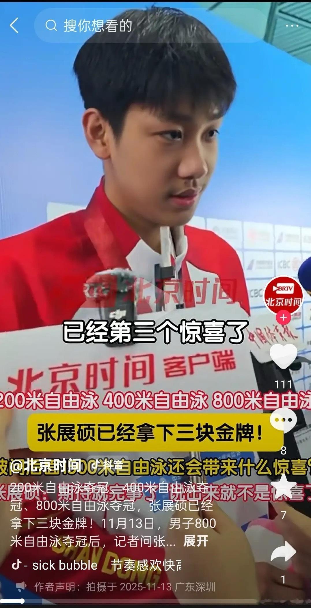 太可怕了,张展硕手里的两块金牌还没有捂热,今天就在800米自由泳的决赛上,以7分46秒69的成绩,刷新之前由自己保持的全国青年记录,一举拿下金牌。在接连夺得200米,400米,800米自由泳冠军后,18岁的张展硕已然成为本届全运会游泳池里最闪亮的那颗星。也正是由于他的出色发挥,山东队才能在本次全运会上,力压浙江队,成为游泳场上的最大赢家。但最可贵的是,张展硕丝毫没有骄傲,直言“提高这么一点没有意义”,更重要的是不断保持进步。如此优秀谦虚的张展硕,大家认为他未来能达到孙杨的高度吗?